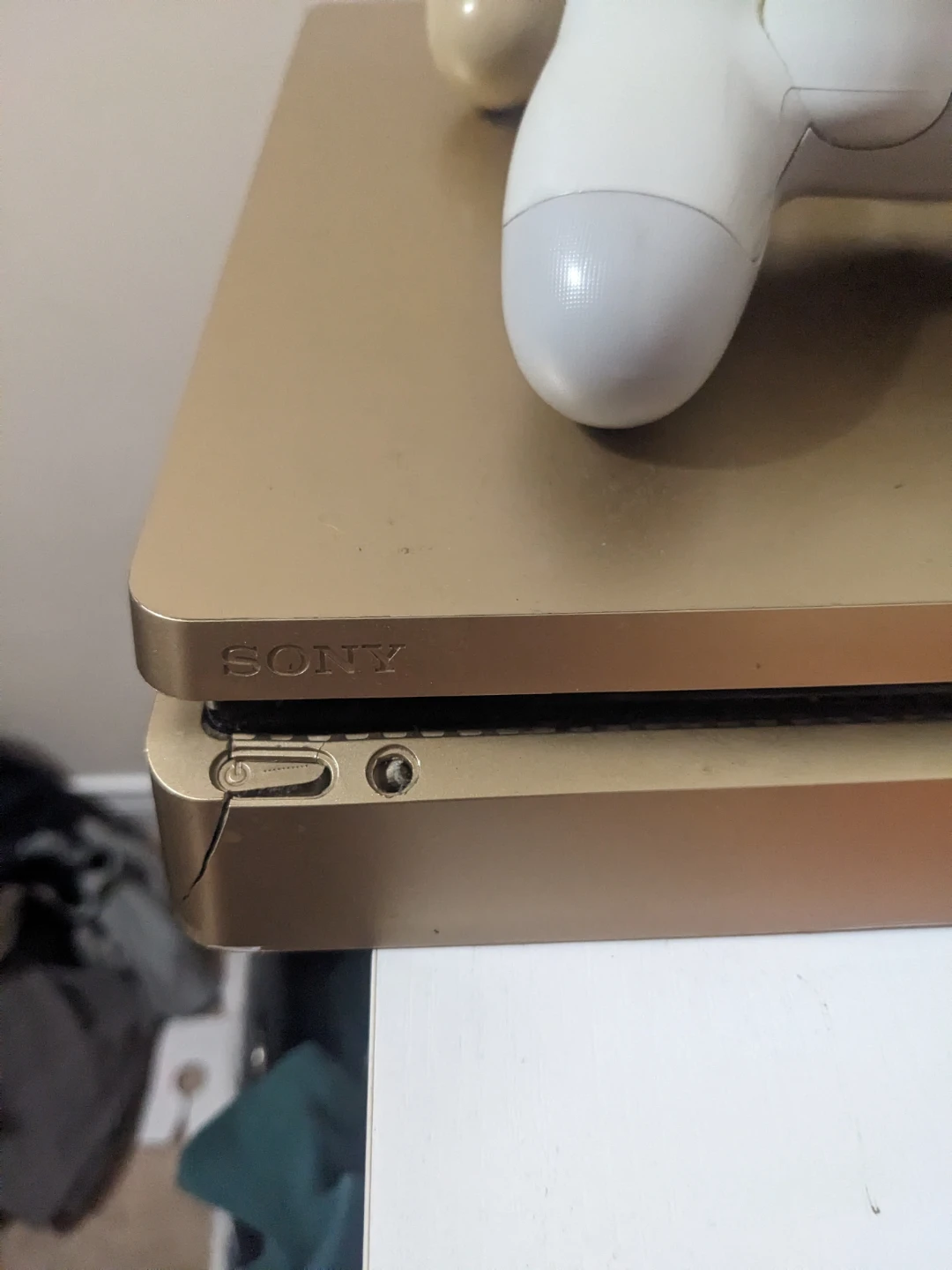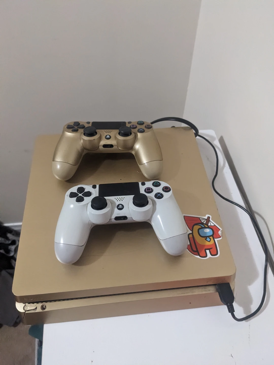 Selling a gold Sony PlayStation 4 console. It comes with two controllers, one gold and one white. There's a crack on the console as shown in the pictures, but it's in otherwise good condition!