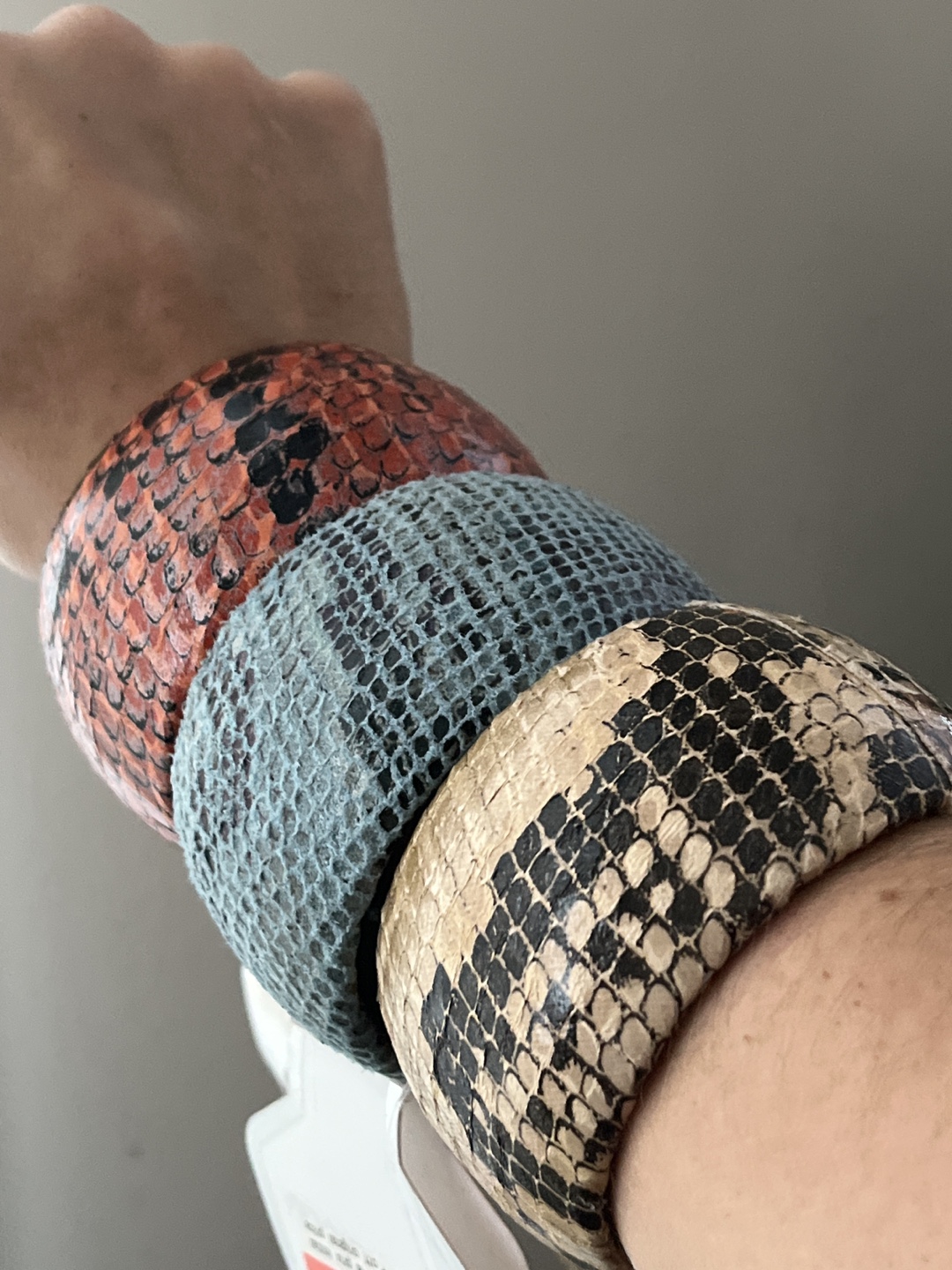 Set of three wide bangles features snakeskin patterns in orange, blue, and beige. Unique statement pieces for accessorizing.