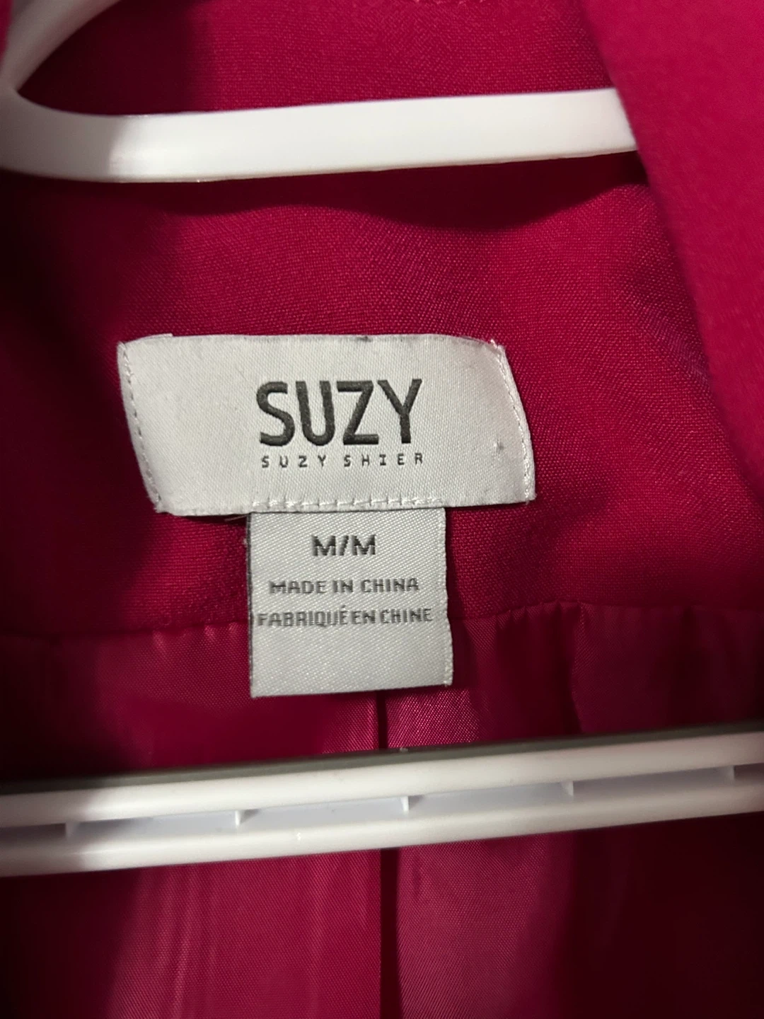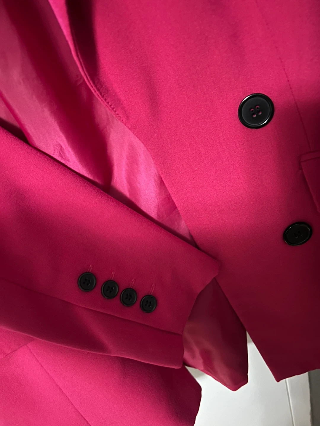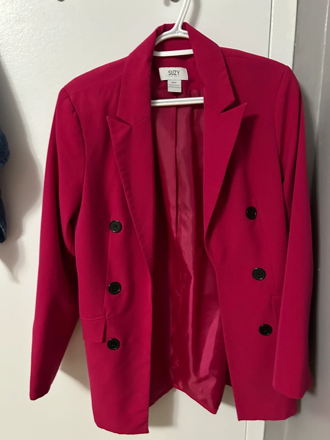 Selling a Suzy Shier blazer in a vibrant pink colour! It's a size M/M and features a classic double-breasted design with black buttons. Perfect for adding a pop of colour to your wardrobe and can be dressed up or down for any occasion