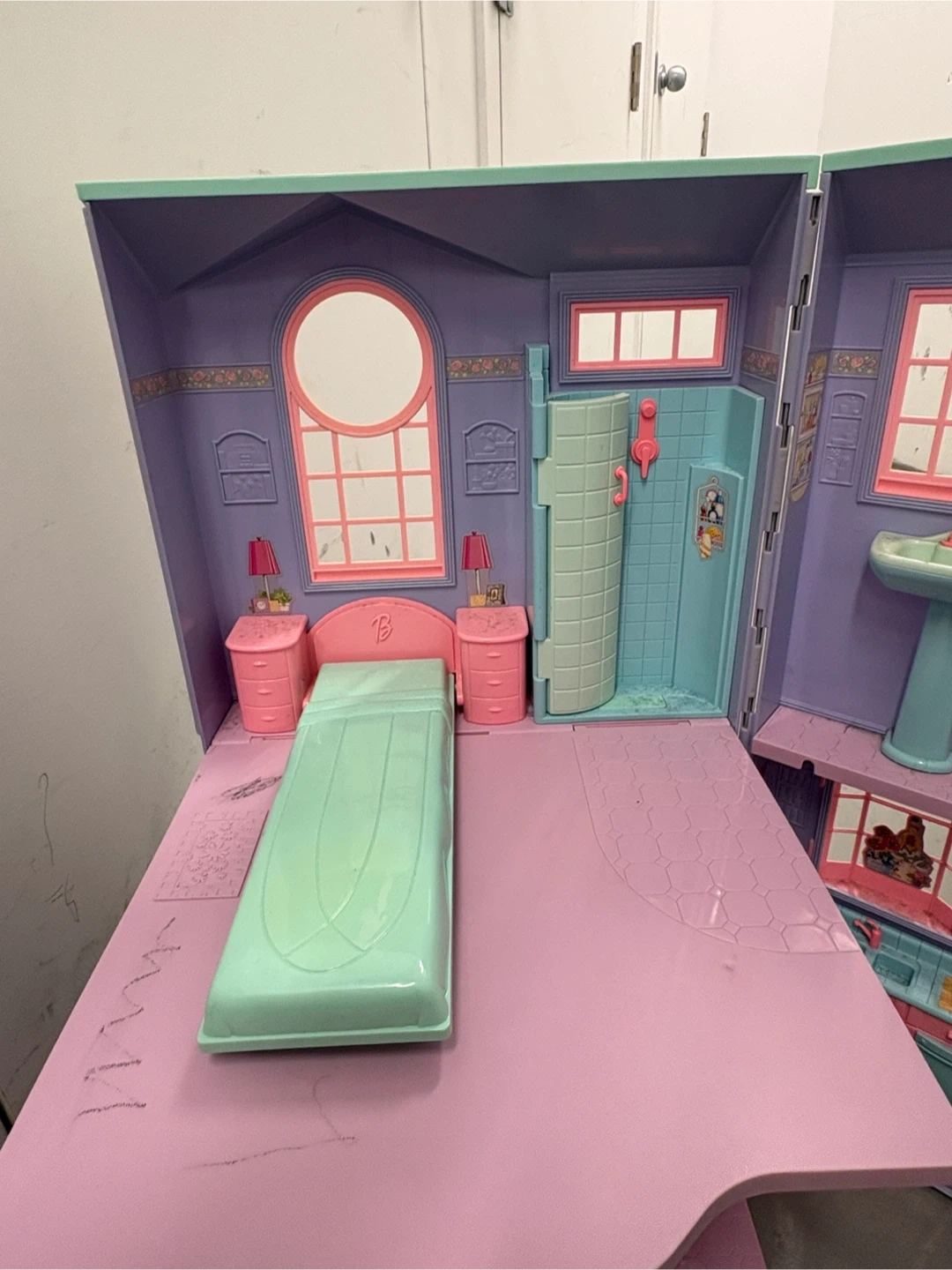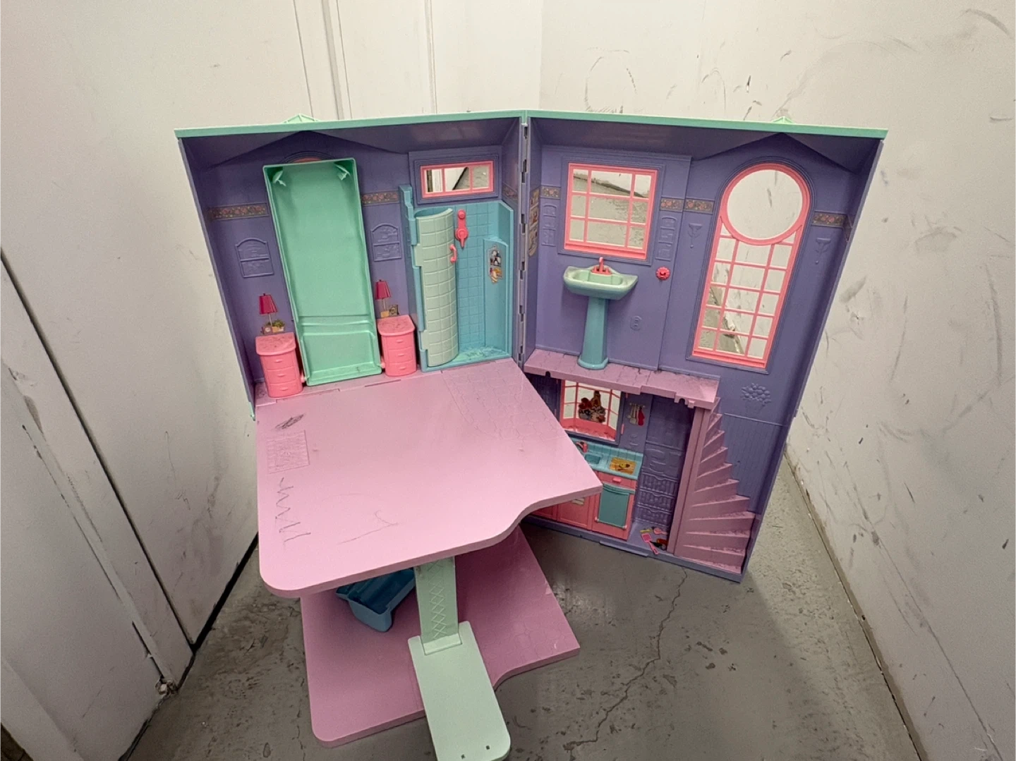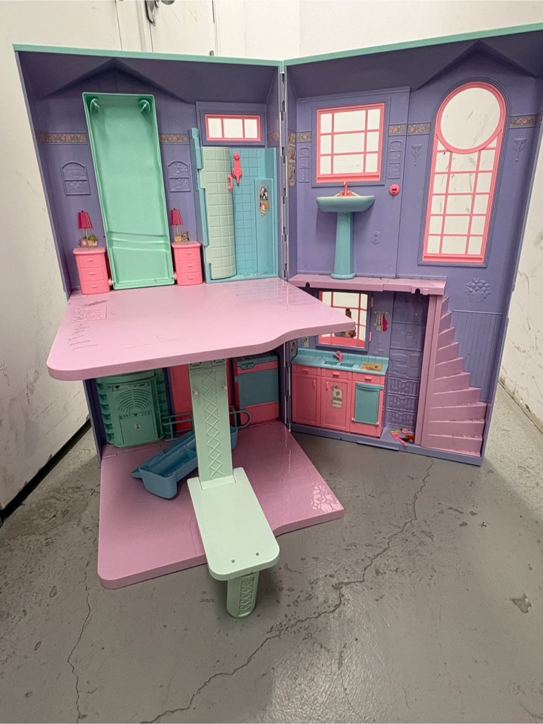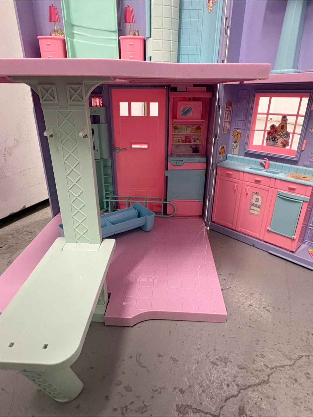 This foldable dollhouse is a fun accessory for your Barbie collection. It features a bedroom, bathroom, and kitchen area. The pink and purple plastic construction is durable for playtime. It unfolds for easy access to all rooms!