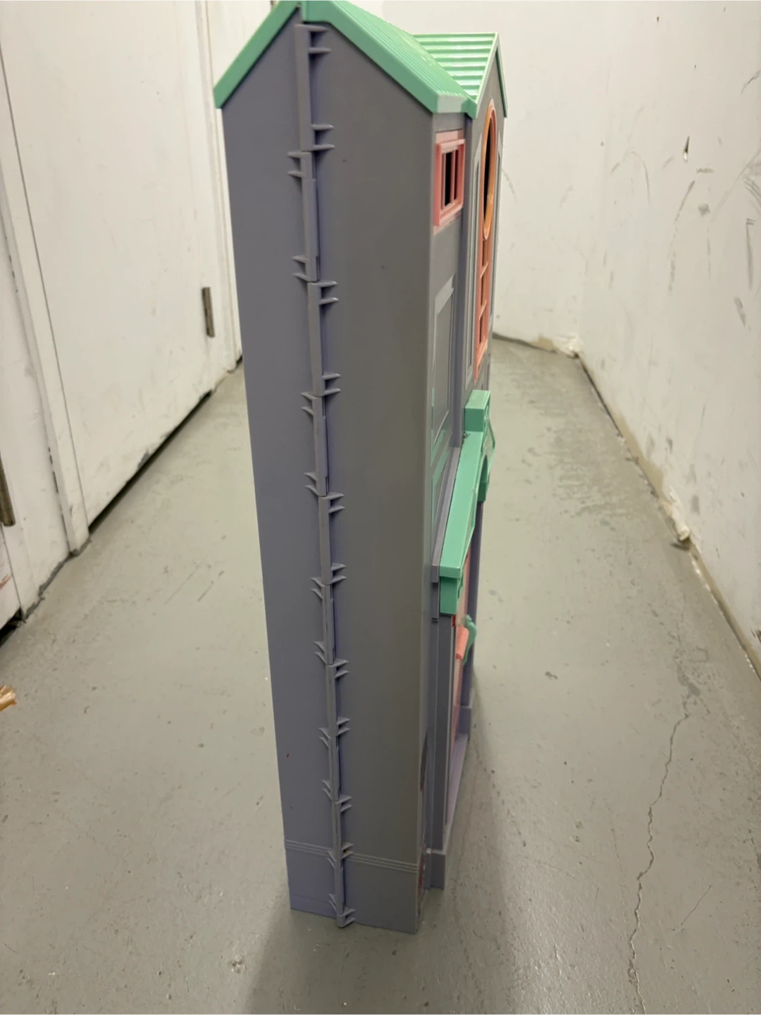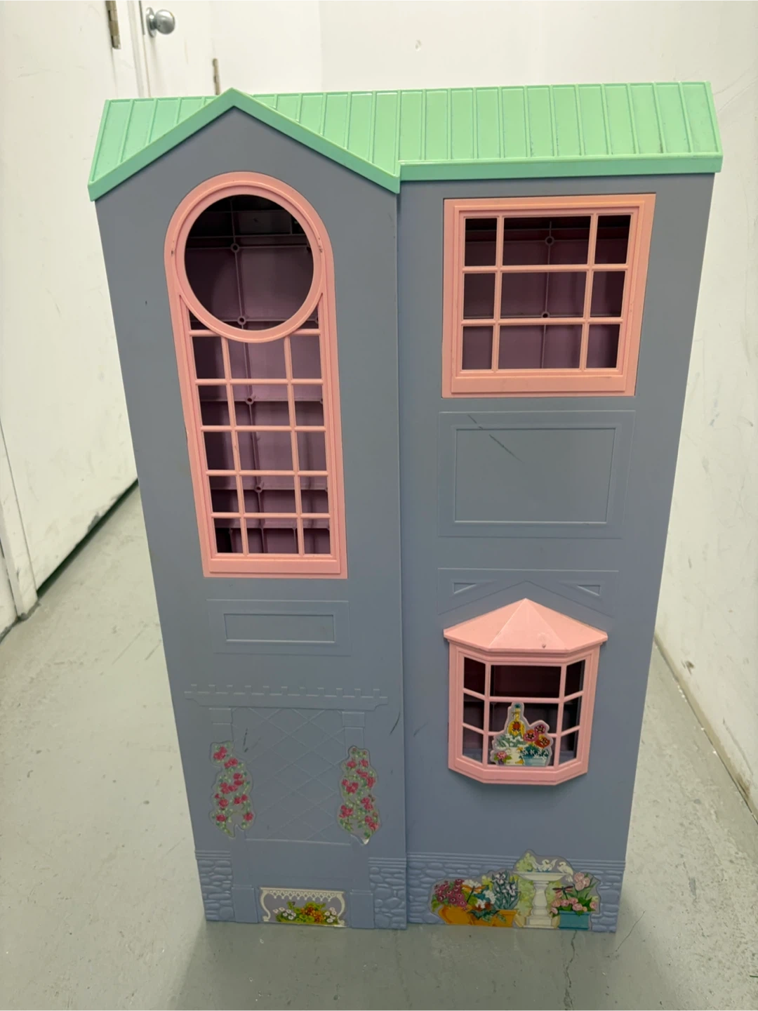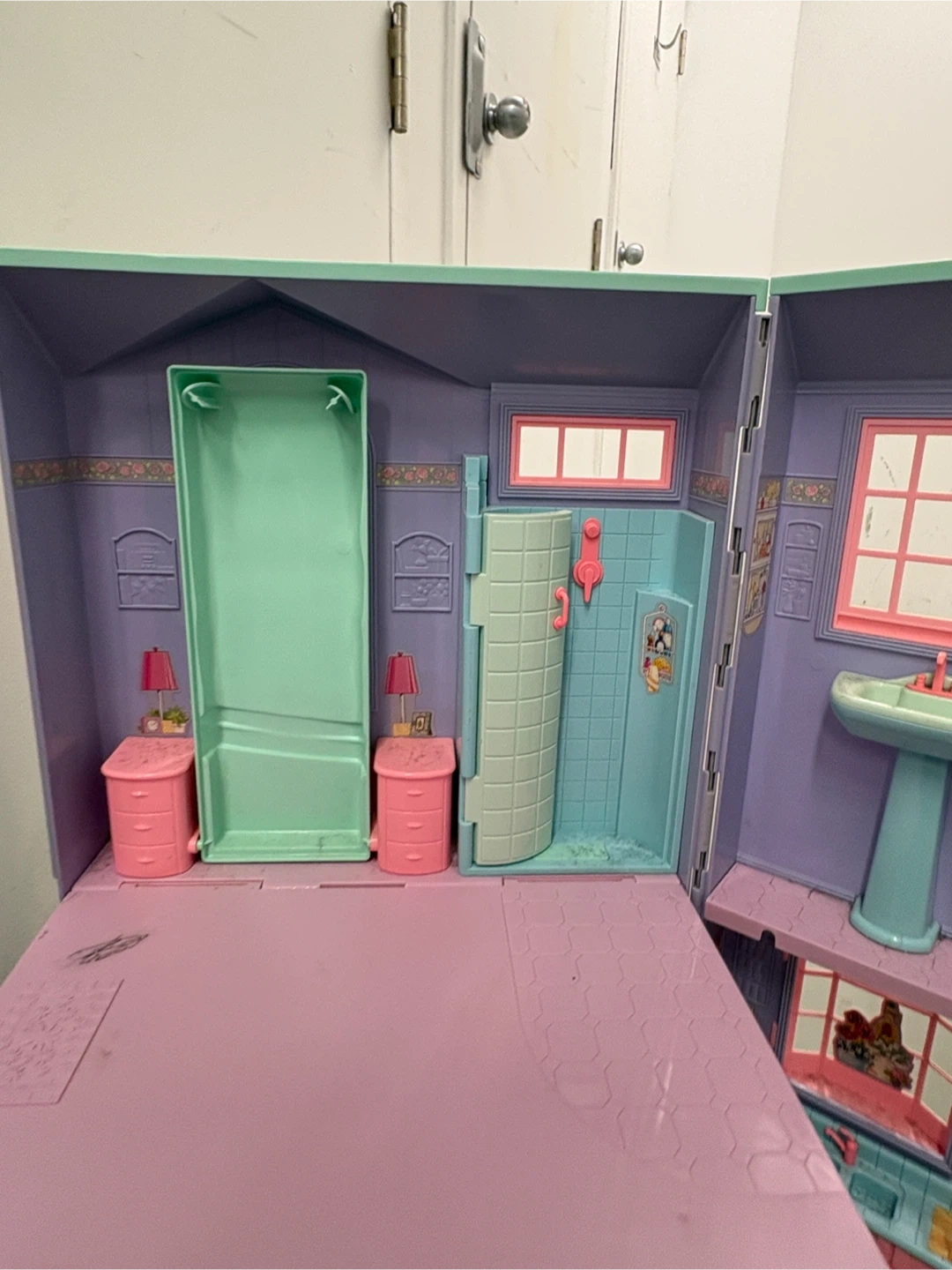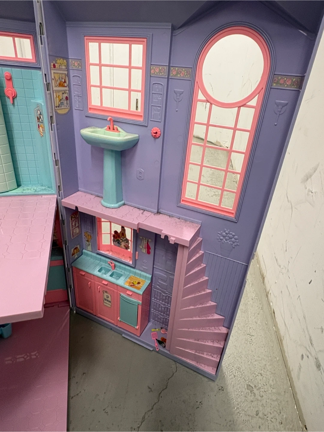 This foldable dollhouse is a fun accessory for your Barbie collection. It features a bedroom, bathroom, and kitchen area. The pink and purple plastic construction is durable for playtime. It unfolds for easy access to all rooms!