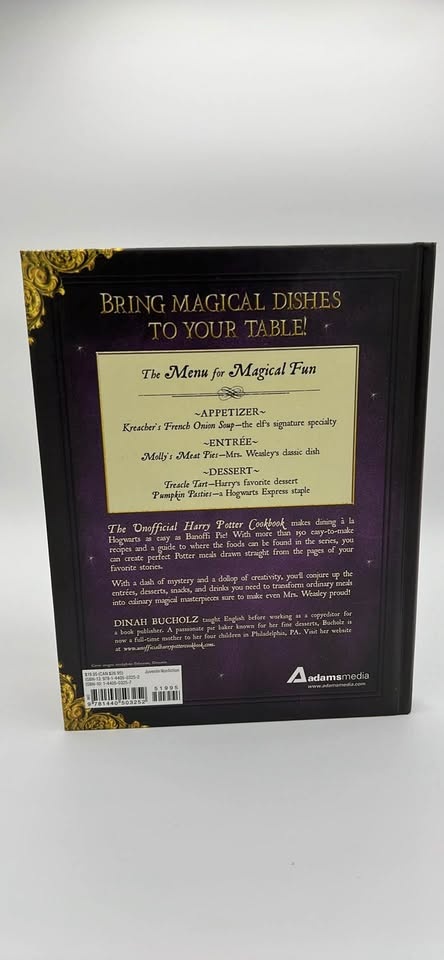 Magical cookbook with over 150 recipes for wizards and non-wizards alike! This unofficial Harry Potter cookbook has recipes like Kreacher's French Onion Soup, Molly's Meat Pies, Treacle Tart, and Pumpkin Pasties. Written by Dinah Bucholz. Selling because moving out of state. Let me know if you're interested!
