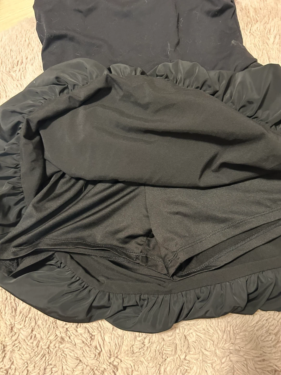 This is a black halter dress from Garage. It's a size P/S. It's made with a flowy skirt and includes built-in shorts.