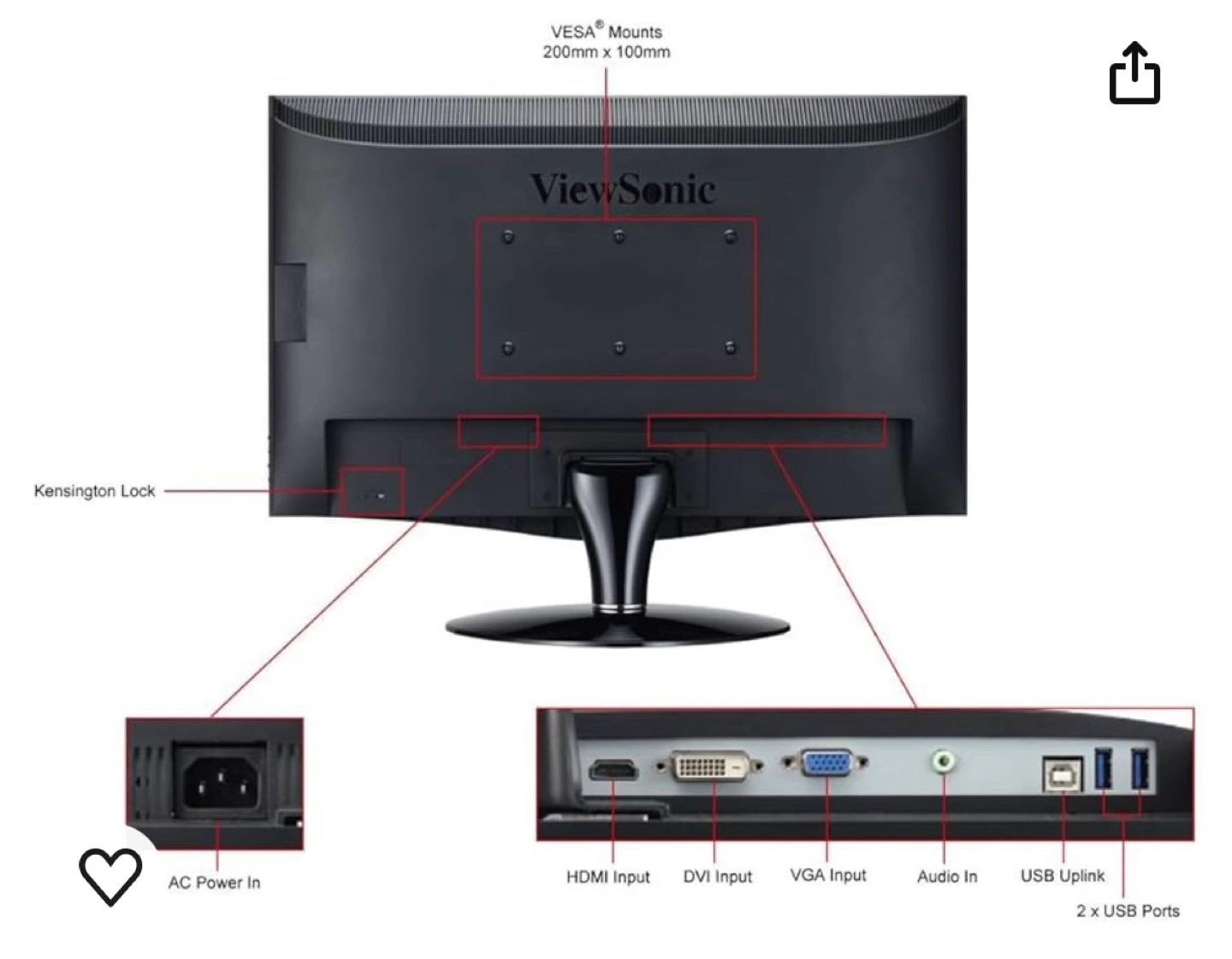 • 200mm x 100mm VESA compliant for wall mount or monitor stands
