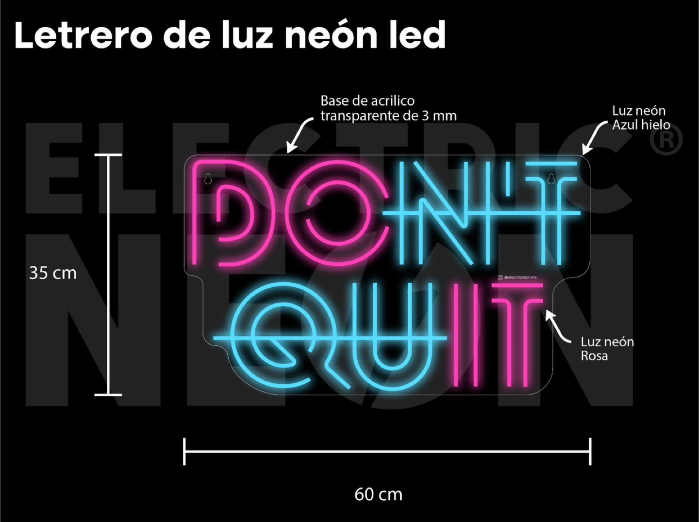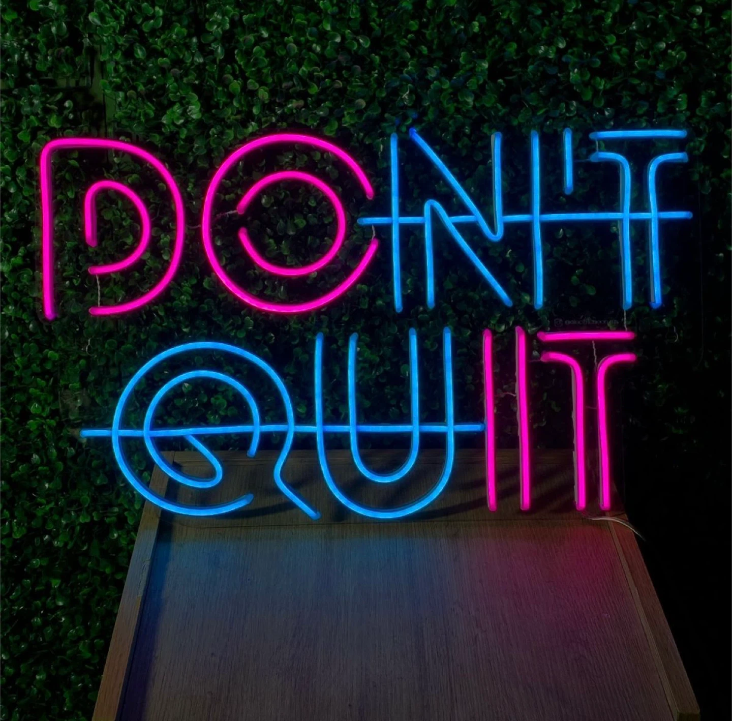 Selling a fun LED neon sign that reads "Don't Quit"! It features a mix of bright pink and blue neon lights. The sign is mounted on a 3mm transparent acrylic base. It measures 35 cm in height and 60 cm in width, perfect for adding a pop of colour to any room