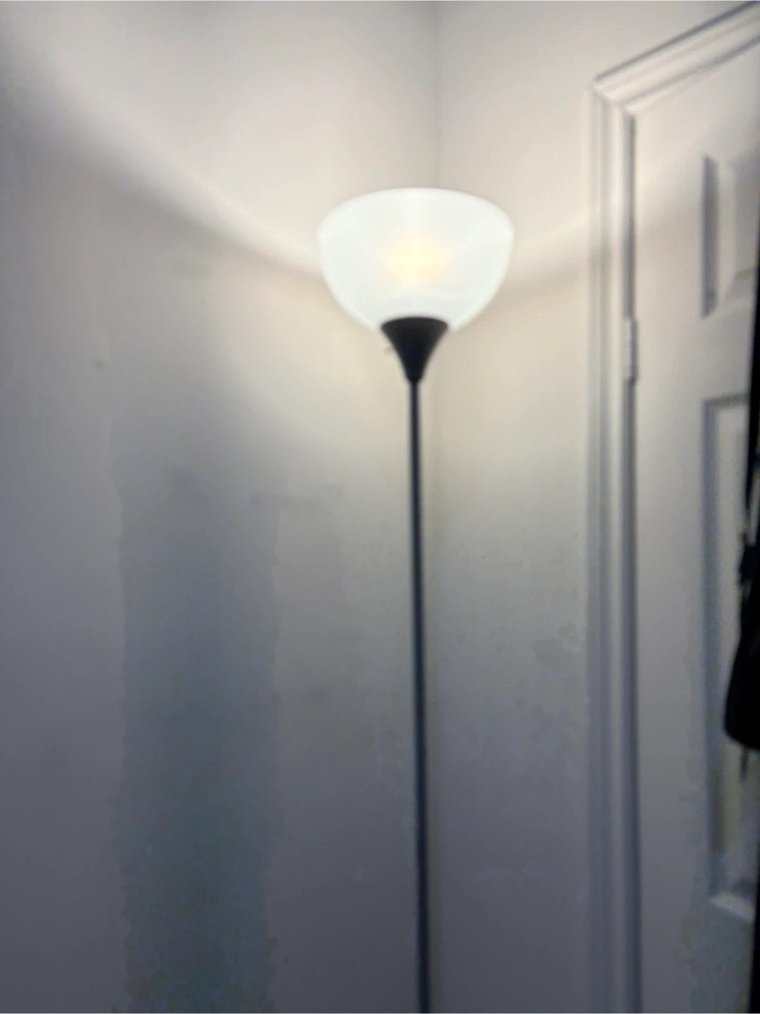 A sleek floor lamp with a grey metal pole and a frosted globe shade. It's perfect for adding ambient lighting to any room. Lamp stands tall and provides a warm glow.