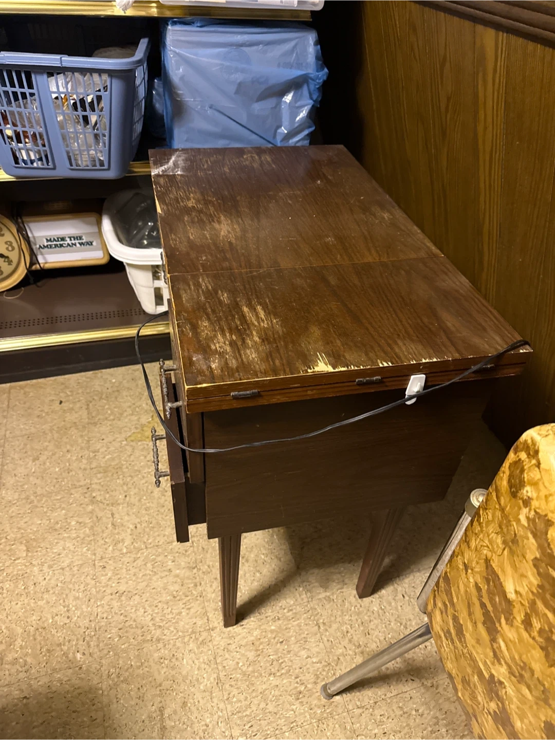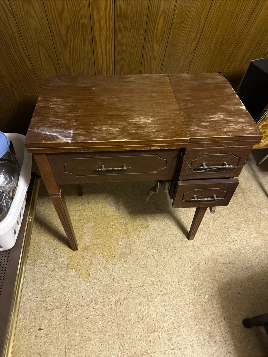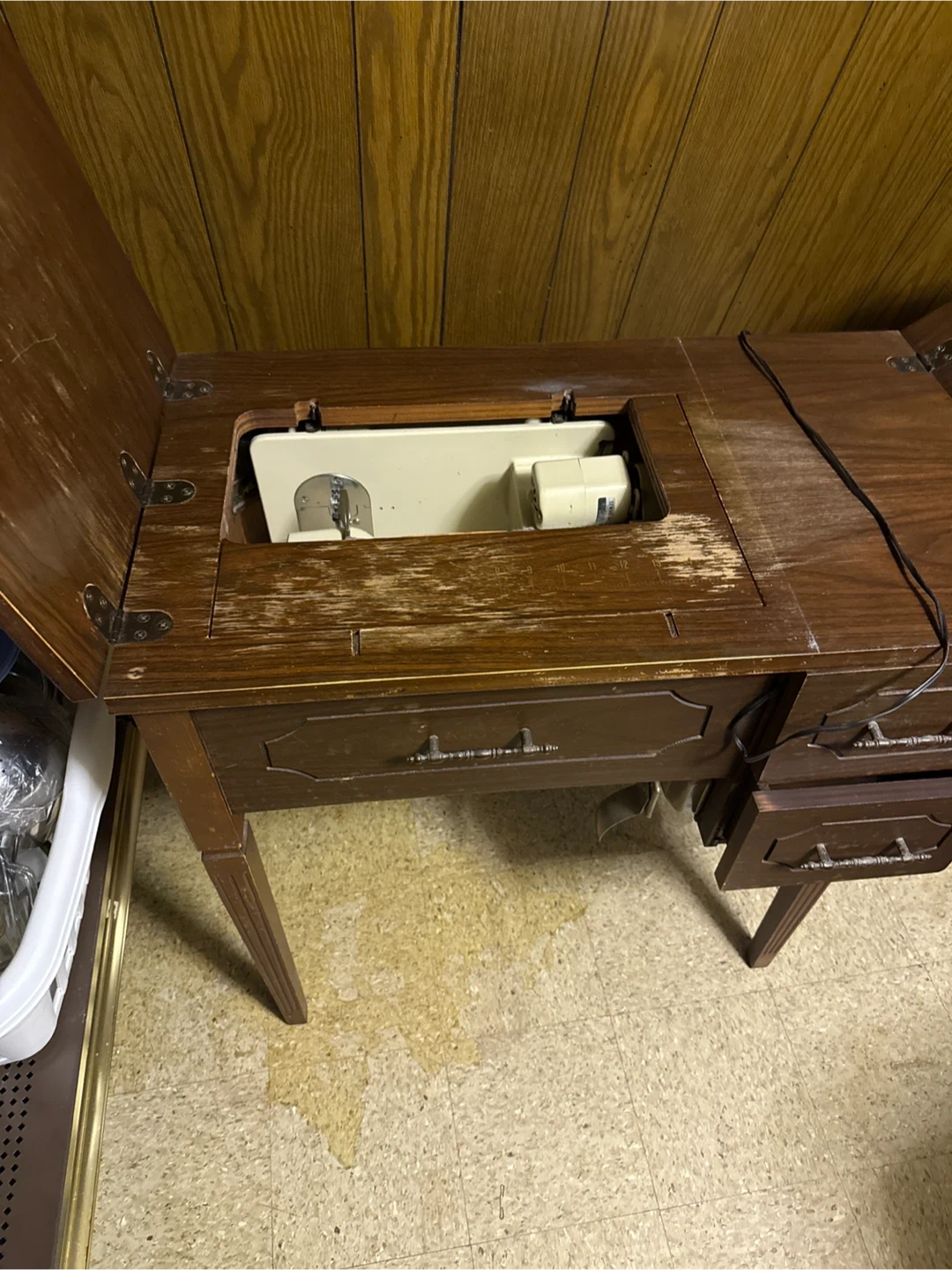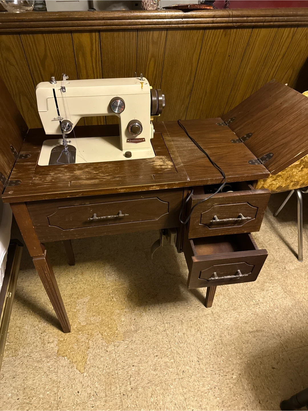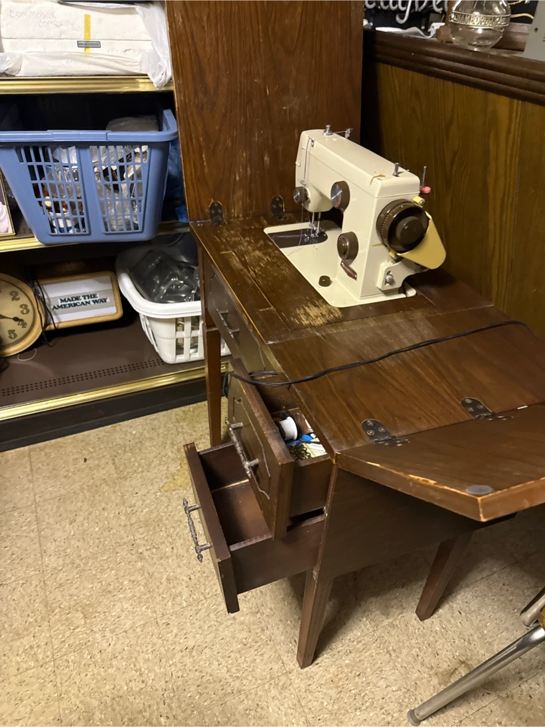 Selling a vintage Craftsman sewing machine integrated into a wooden cabinet. The machine is beige with gold-toned accents. Cabinet has drawers for storage. A classic piece for any sewer!