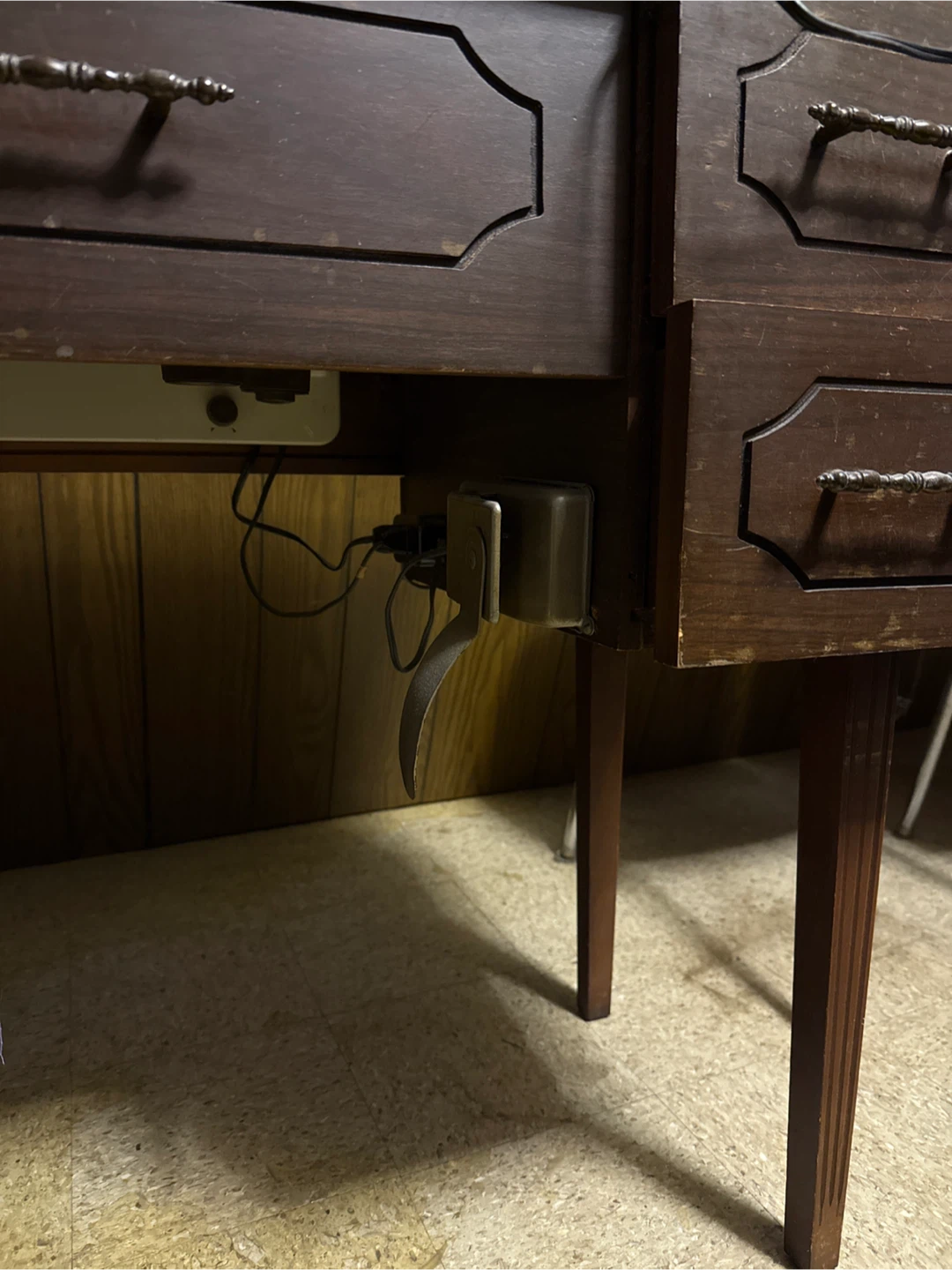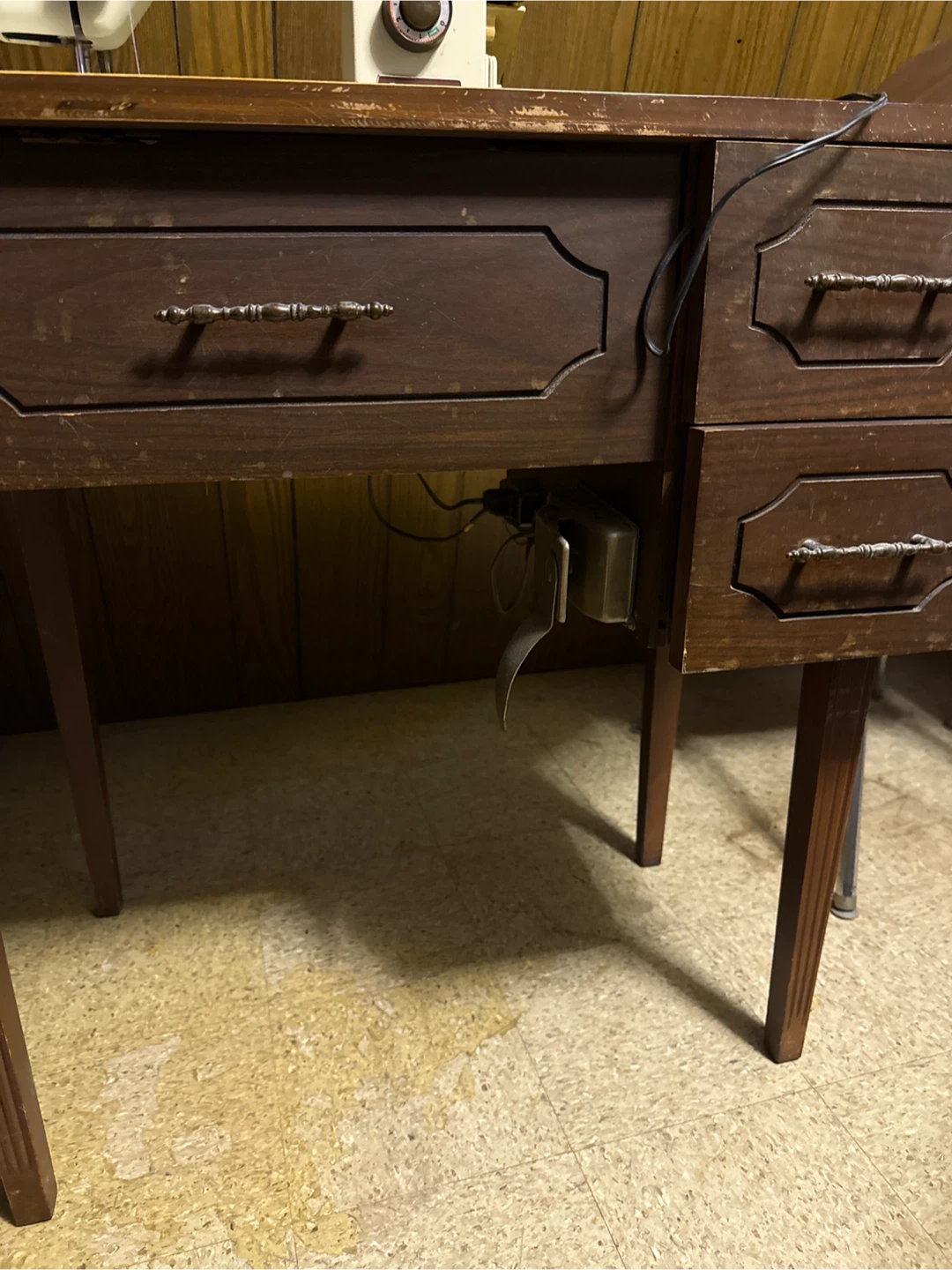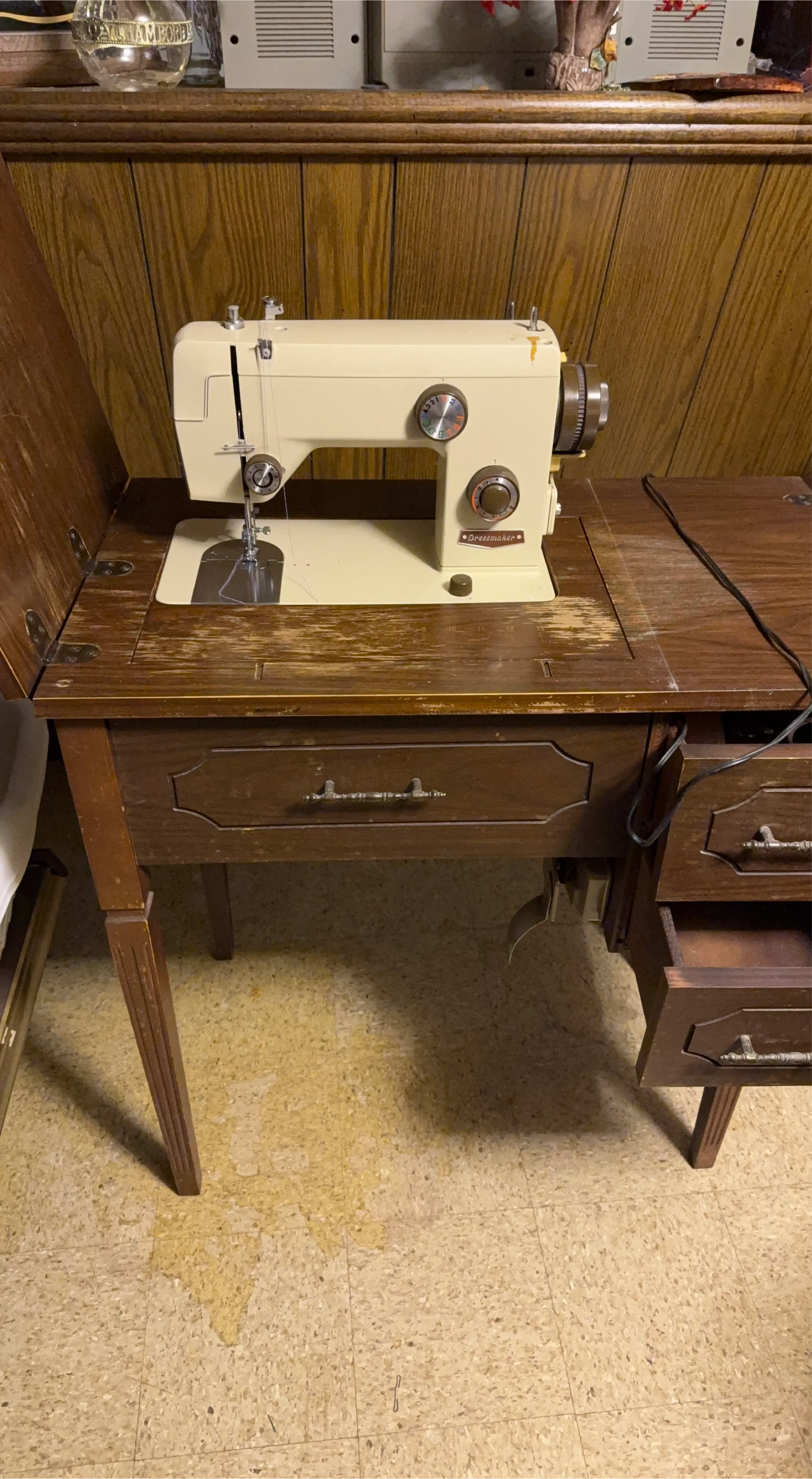 Selling a vintage Craftsman sewing machine integrated into a wooden cabinet. The machine is beige with gold-toned accents. Cabinet has drawers for storage. A classic piece for any sewer!