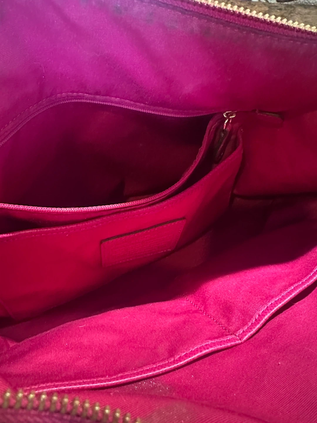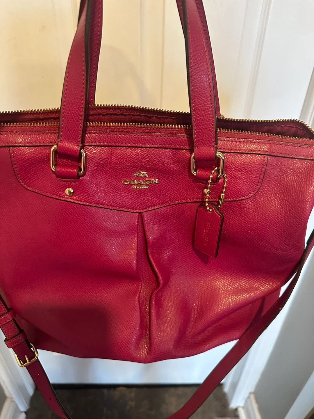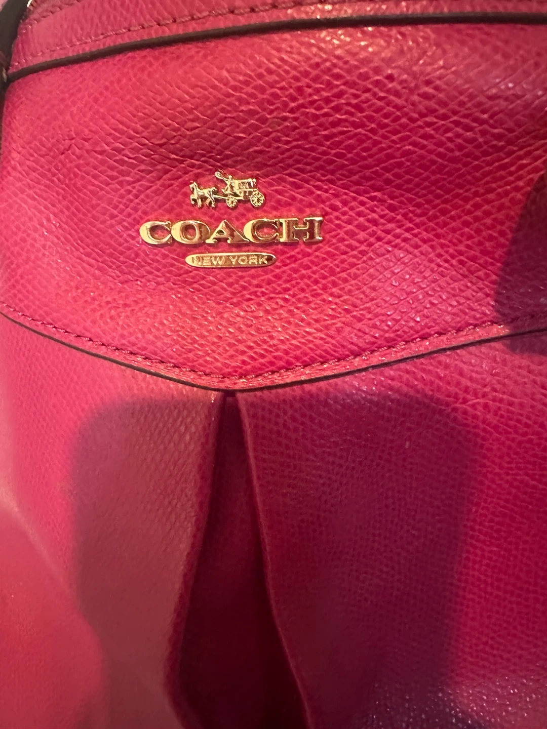 This is a Coach satchel handbag in a vibrant pink leather. It's made with genuine leather and features multiple interior pockets for organization. Includes a detachable crossbody strap for versatile wear.
