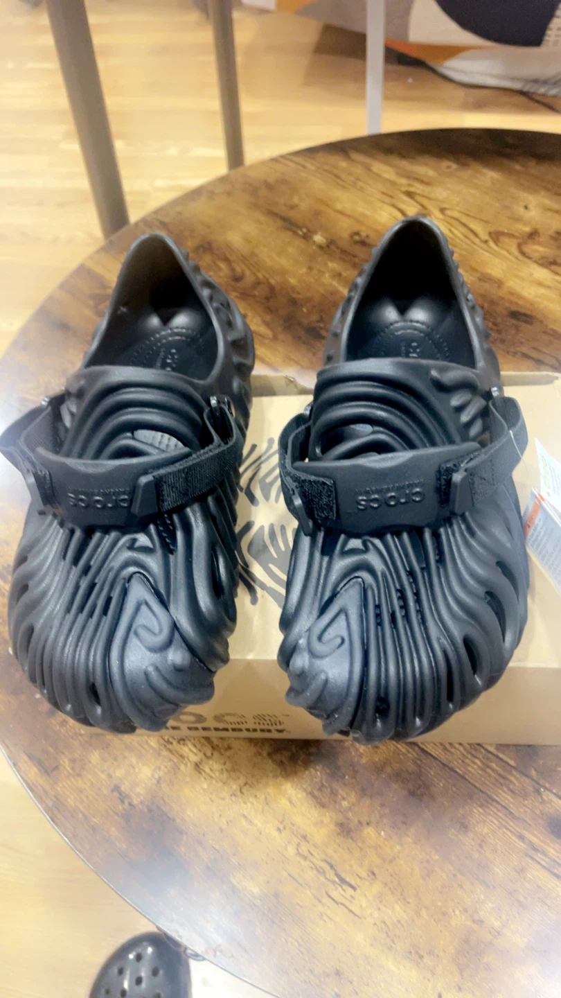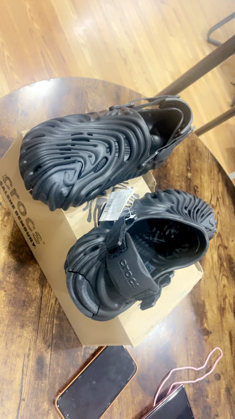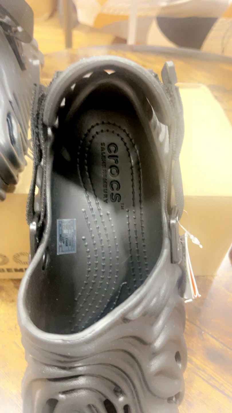 These Crocs Midsommar All Terrain Clogs are black and feature a unique, sculpted design. They come with a heel strap for a secure fit. Includes original box.