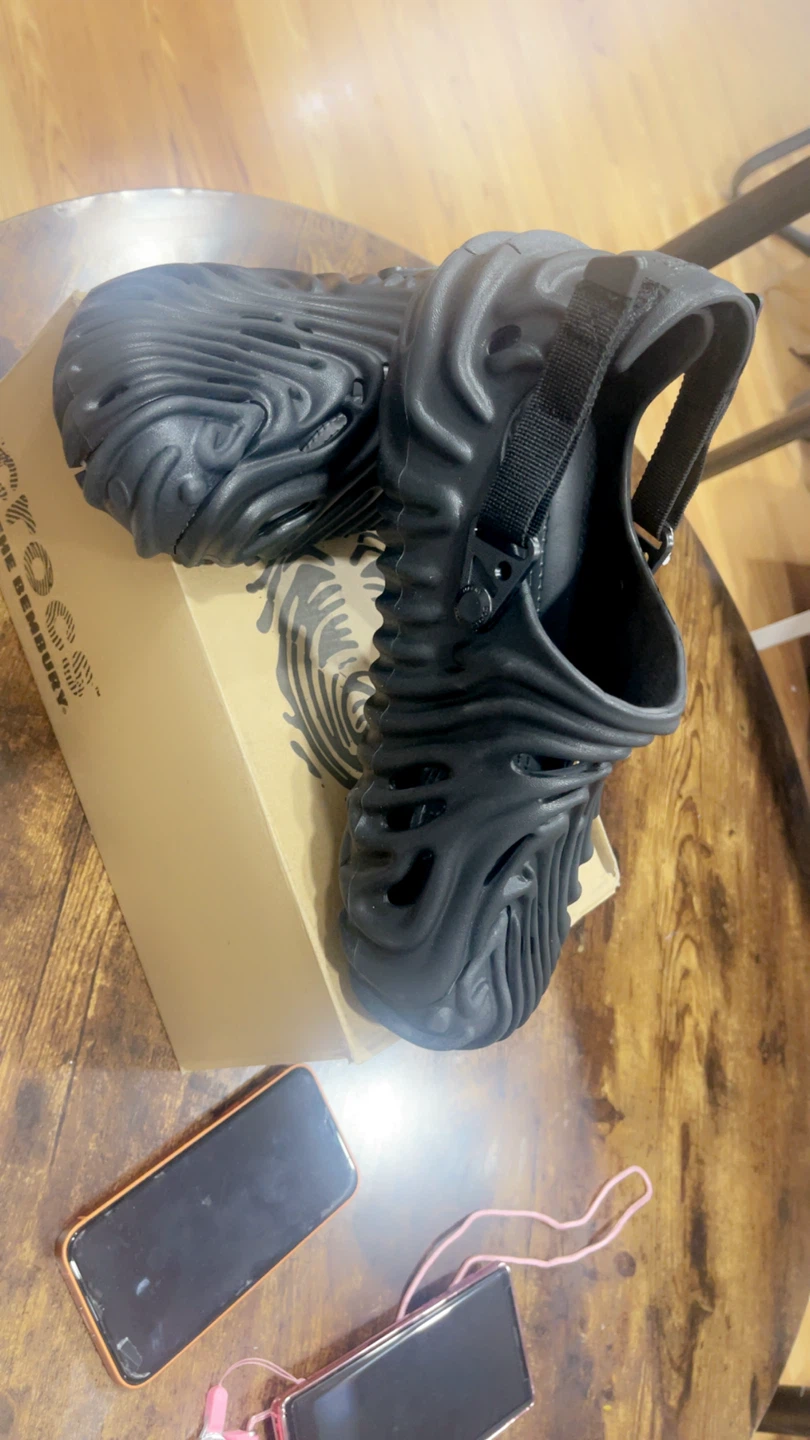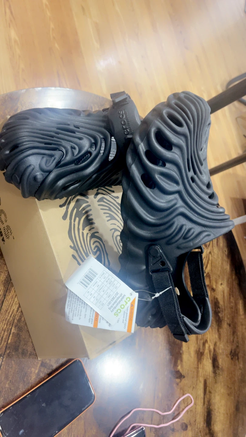 These Crocs Midsommar All Terrain Clogs are black and feature a unique, sculpted design. They come with a heel strap for a secure fit. Includes original box.