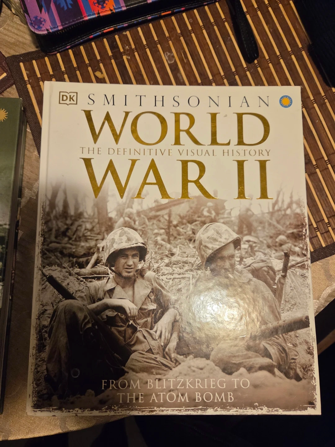 This book is "World War II: The Definitive Visual History" from DK Smithsonian. It covers history from Blitzkrieg to the Atom Bomb. It's a comprehensive visual guide to the war.