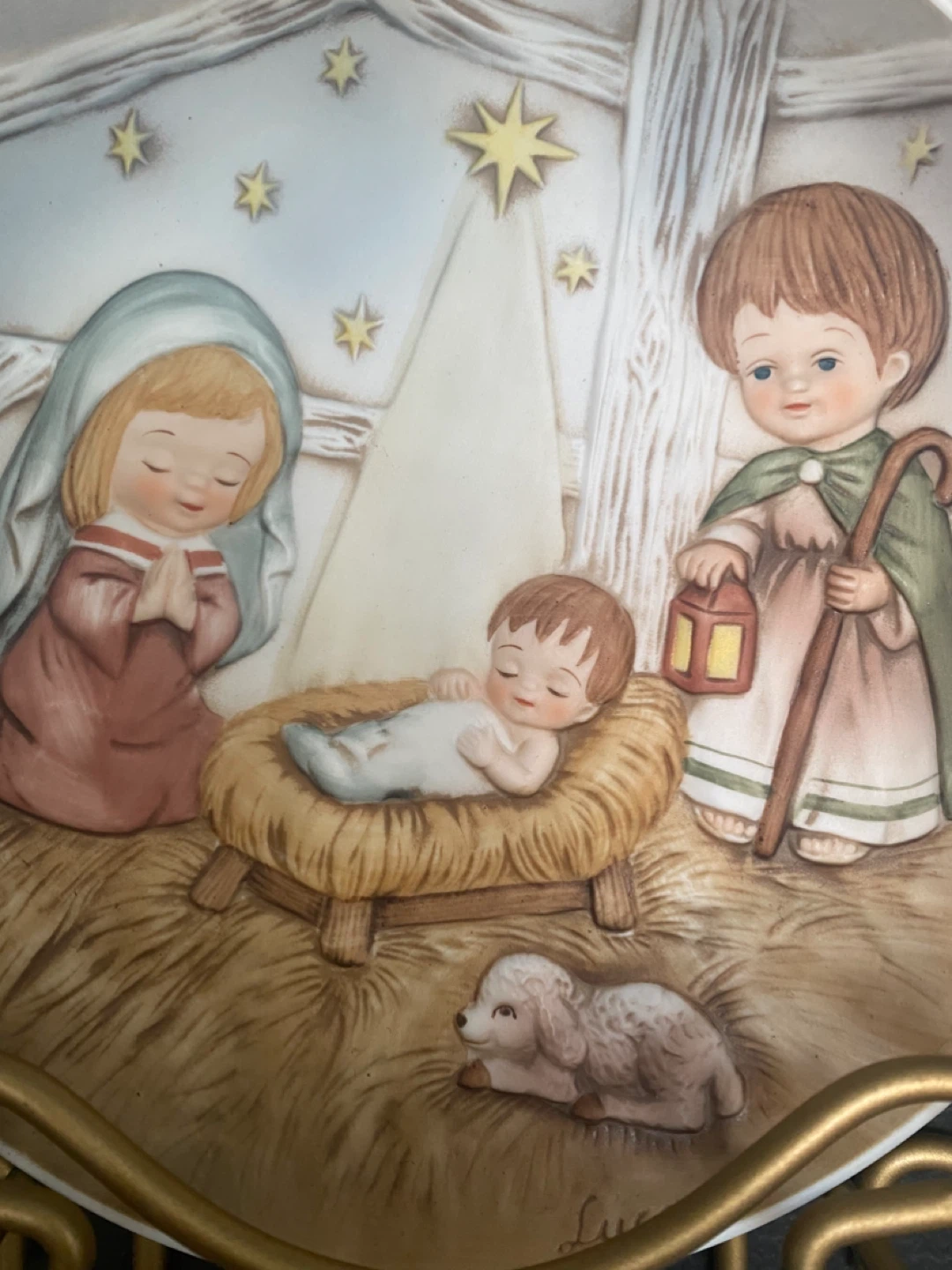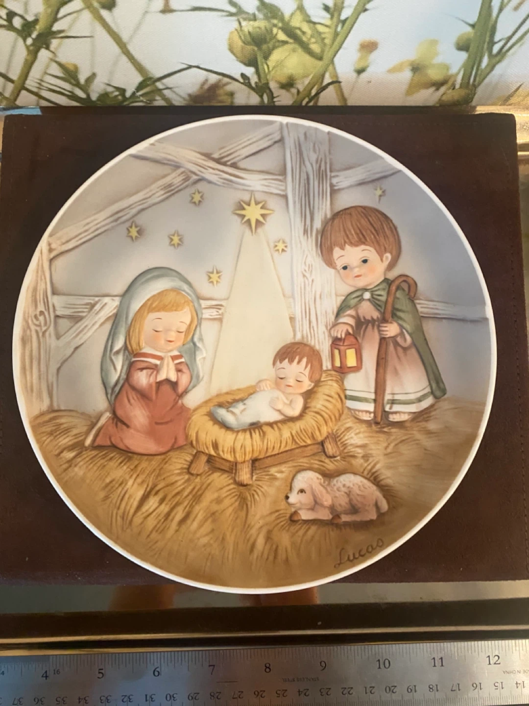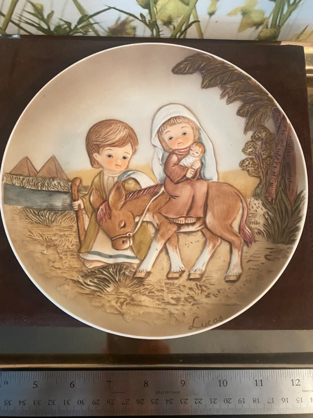 Two Decorative plate featuring a Nativity scene with Mary, Joseph, baby Jesus, and a lamb. It's signed 'Lucas' at the bottom. A lovely piece for holiday decor!@casa_s_decor Pick up in the Bronx