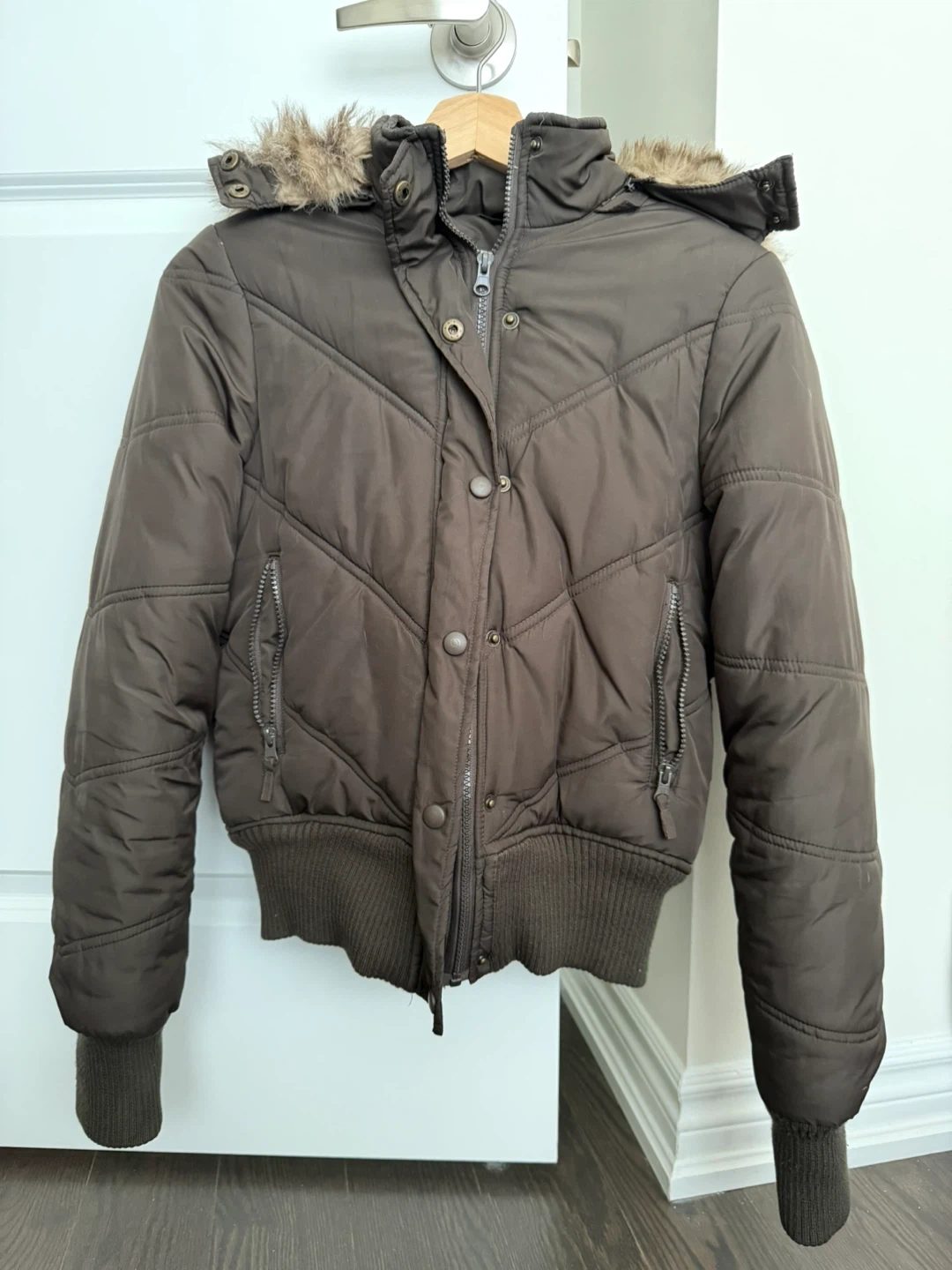 Here's a dark brown outerwear puffer bomber jacket in size small. It's a stylish and warm jacket. The jacket features a faux fur-trimmed hood and a quilted design.