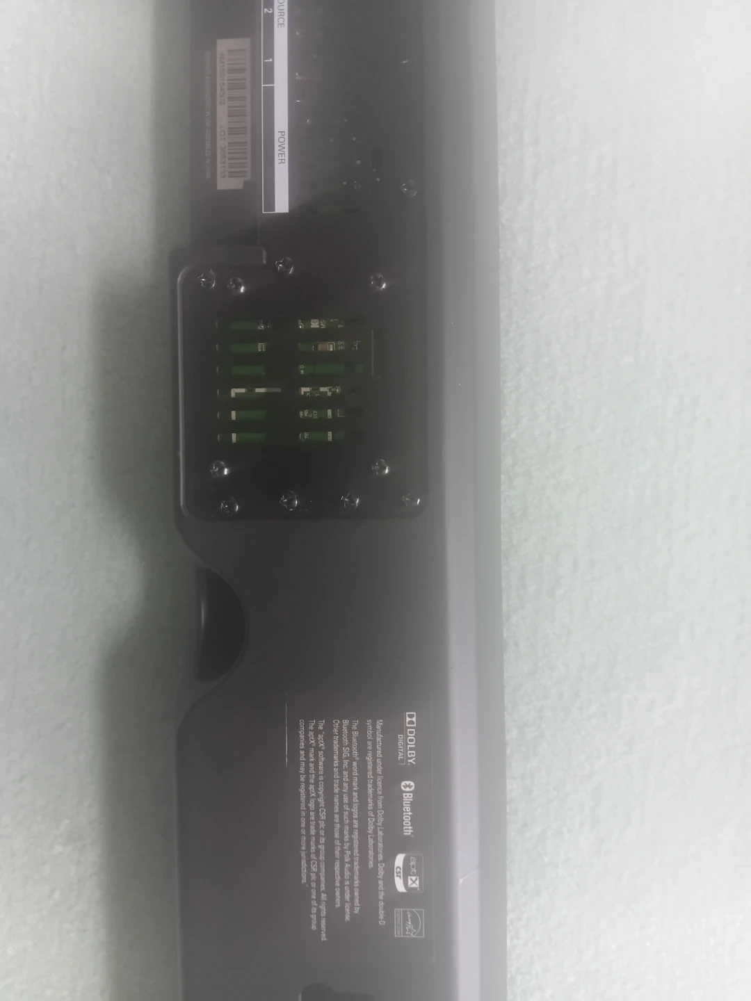 Polk Audio soundbar. Black colour. Has multiple input options like optical and aux. Also has Bluetooth connectivity. 44W power output. Power cord not included.