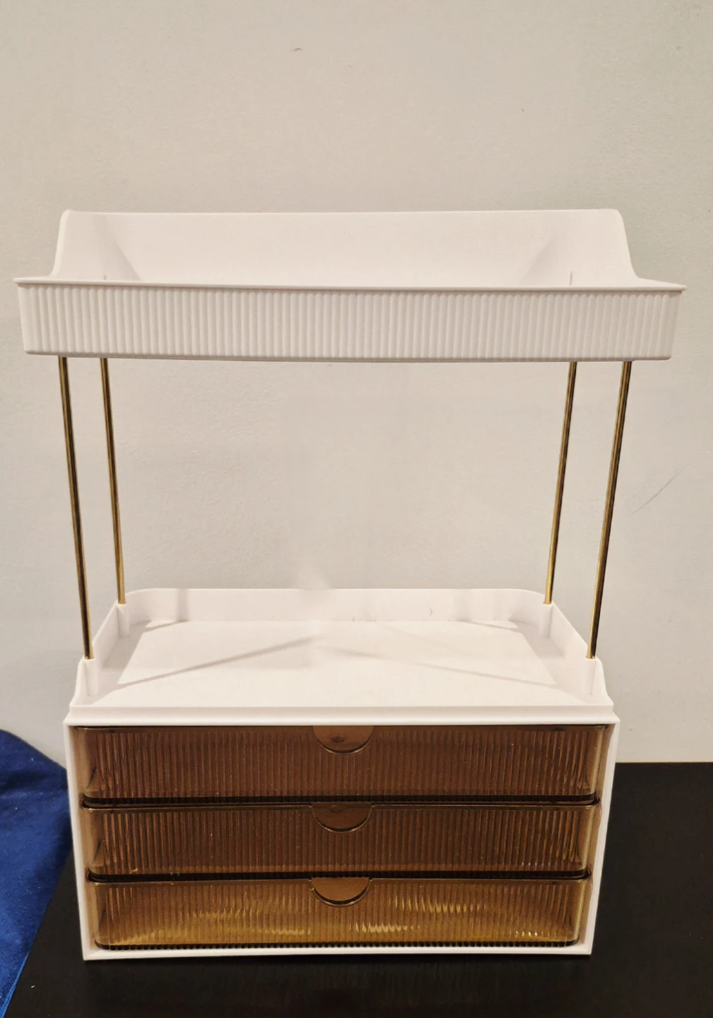 3 Drawers, 2 Tier Bathroom Vanity Organizer Office, Kitchen. Top shelf and three pull-out drawers with gold-tone support poles. Great for cosmetics or kitchen counter storage!