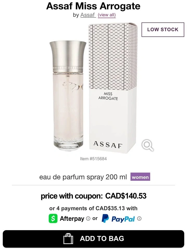 Miss Arrogate by Assaf is an Oriental Floral fragrance for women. Top notes are Bergamot, Grapefruit and Peach; middle notes are Rose, Turkish Rose, Jasmine and Ylang-Ylang; base notes are Patchouli, Musk, Cedarwood, Vetiver, Sandalwood and Vanilla. Pick up around Sunshine Hills Surrey.