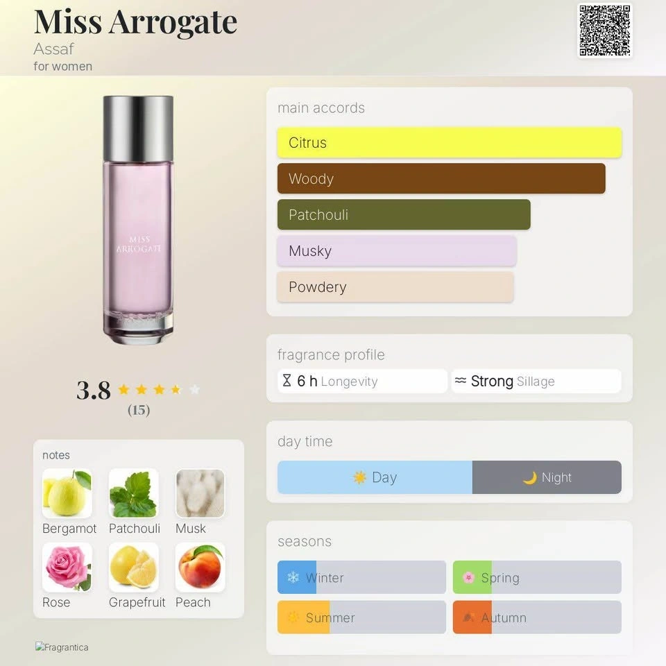 Miss Arrogate by Assaf is an Oriental Floral fragrance for women. Top notes are Bergamot, Grapefruit and Peach; middle notes are Rose, Turkish Rose, Jasmine and Ylang-Ylang; base notes are Patchouli, Musk, Cedarwood, Vetiver, Sandalwood and Vanilla. Pick up around Sunshine Hills Surrey.