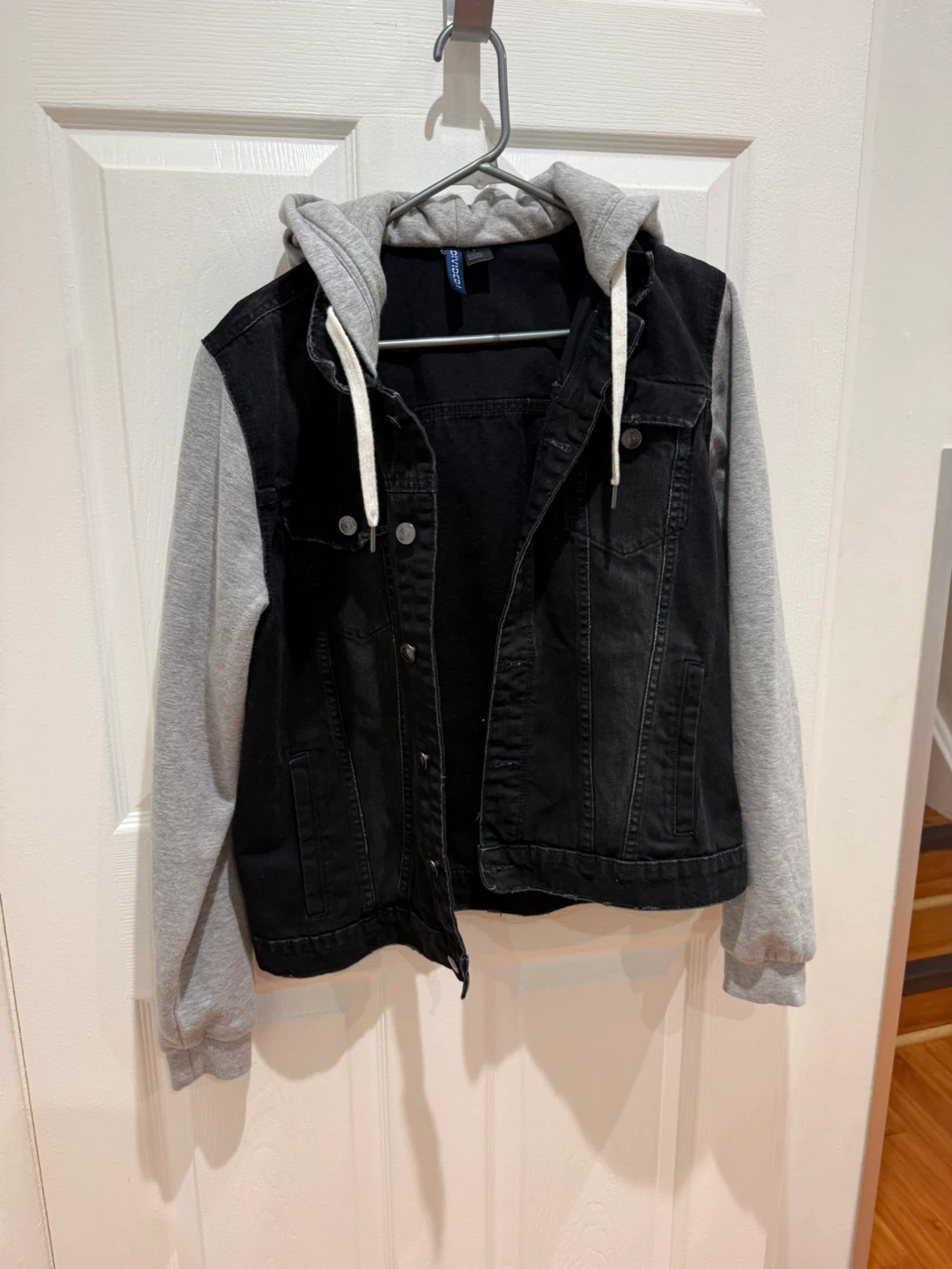 This H&M Divided jacket combines a black denim body with grey contrast sleeves and a built-in hood. It's a size medium and features snap button closures.