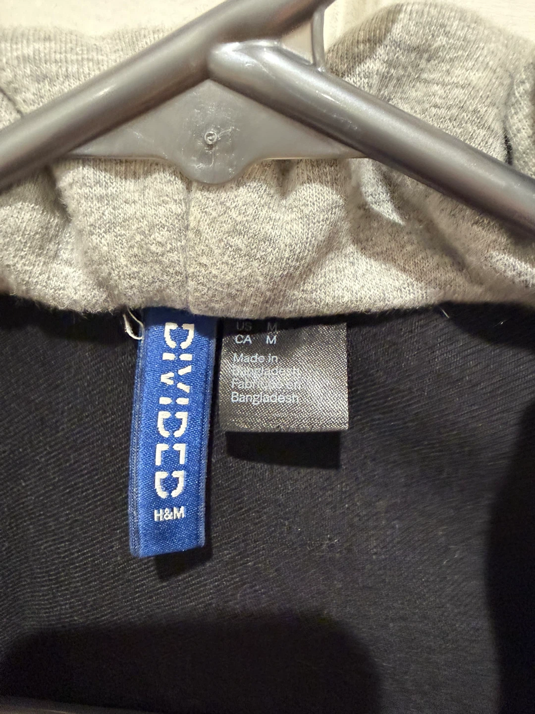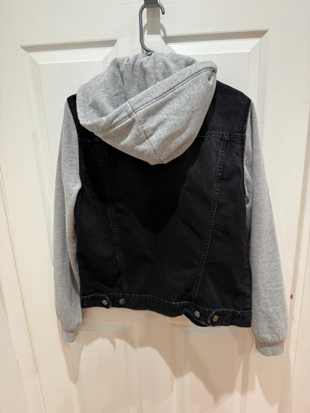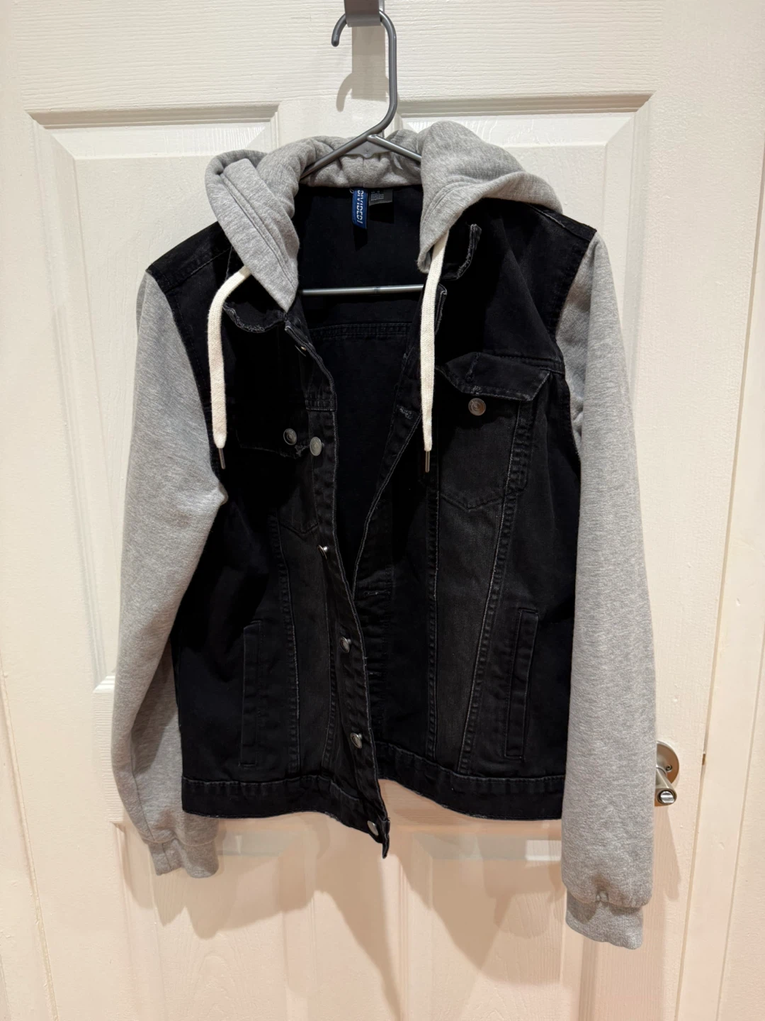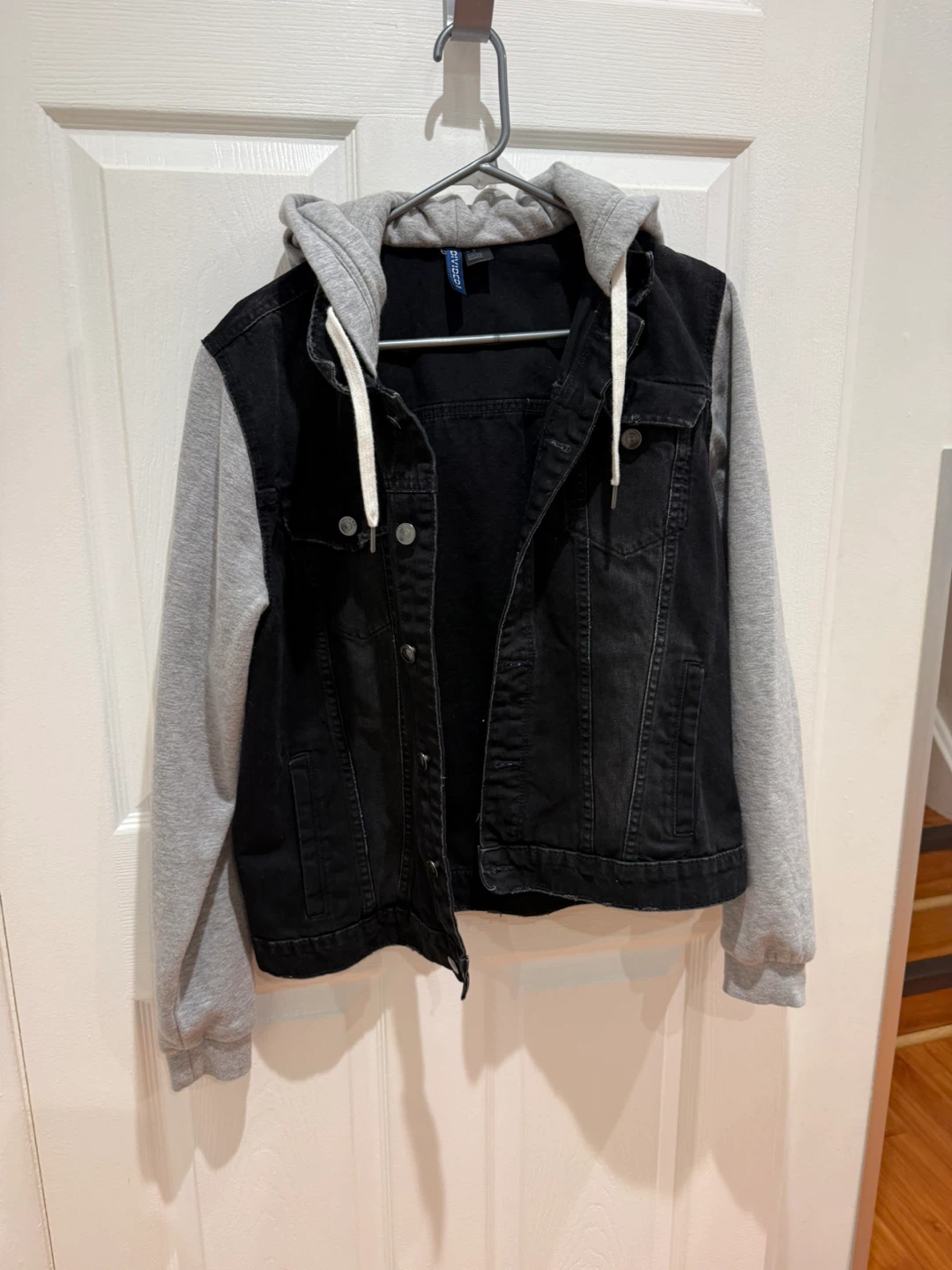 This H&M Divided jacket combines a black denim body with grey contrast sleeves and a built-in hood. It's a size medium and features snap button closures.