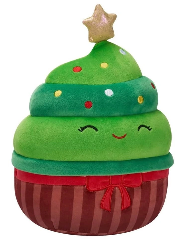 Festive Squishmallows "Myla" plush. This cutie is a Christmas tree cupcake design. Has green frosting layers with colorful 'ornaments' and a gold star on top. The cupcake wrapper part is red and brown stripes with a little red bow. Has a sweet smiling face, super soft and squishy. This ultra-squeezable plush is made with high quality and ultra-soft materials. Add this adorable plush to your Squishmallows collection. This collectible is perfect for Squishmallows fans of all ages. The soft plush is perfect to snuggle with while relaxing at home, watching a movie, during long car rides, sleepovers, plane rides, and for all-out, good, old-fashioned fun! These loveable and squeezable Squishmallows plush characters are the softest and cutest plush toys around!