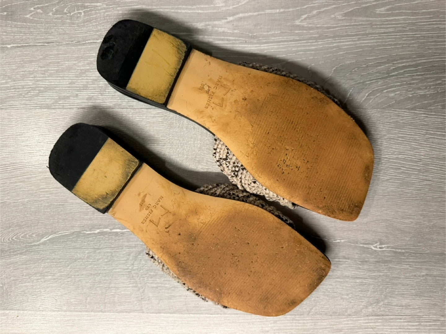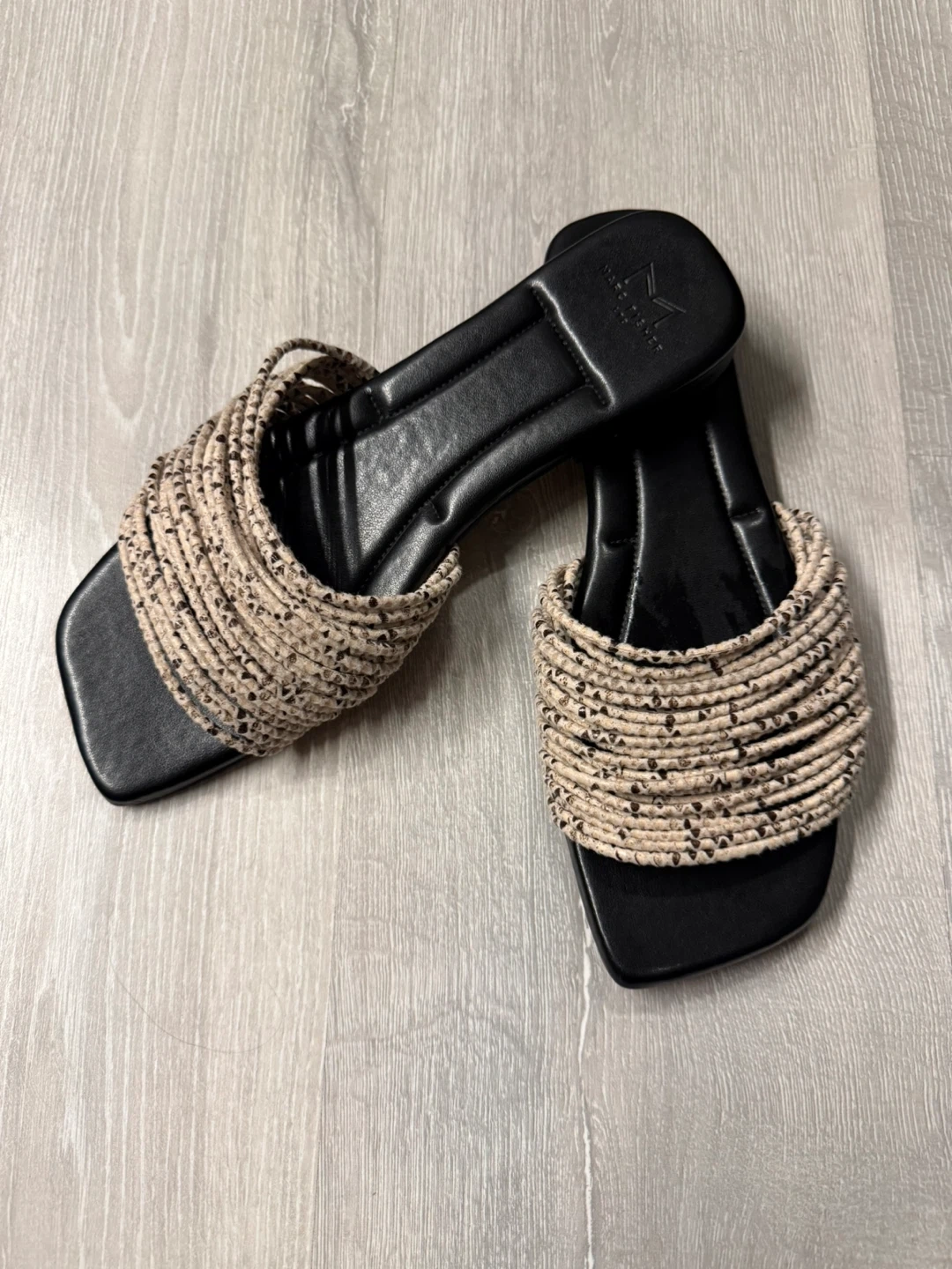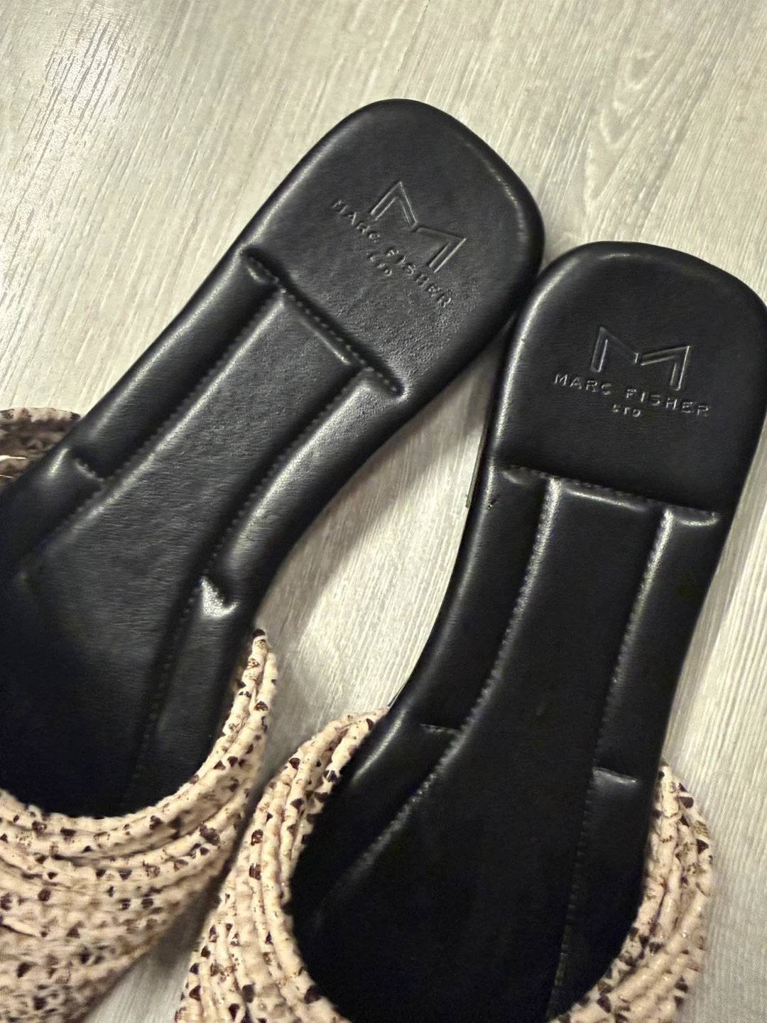 Marc Fisher LTD women's slip-on slide sandals. Features a woven strap detail and a square toe. These slides are great for casual wear!