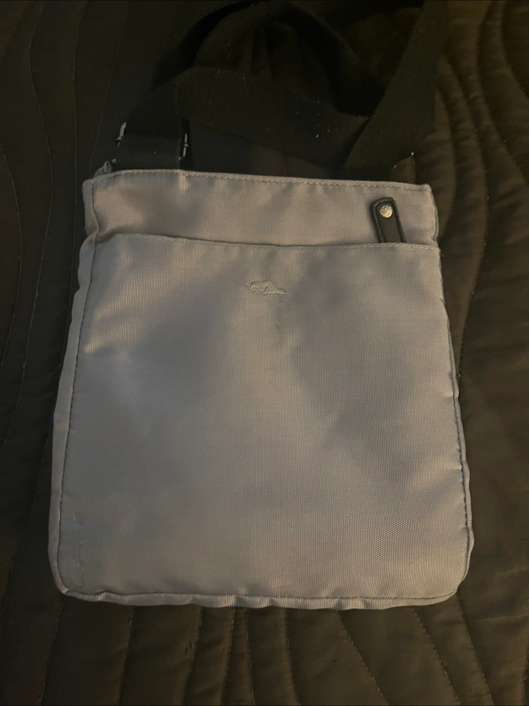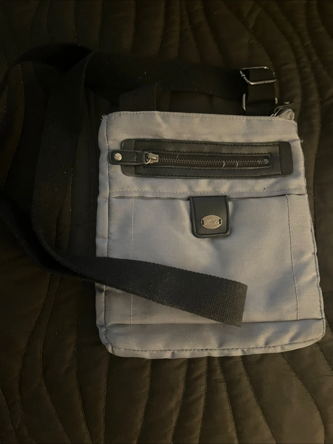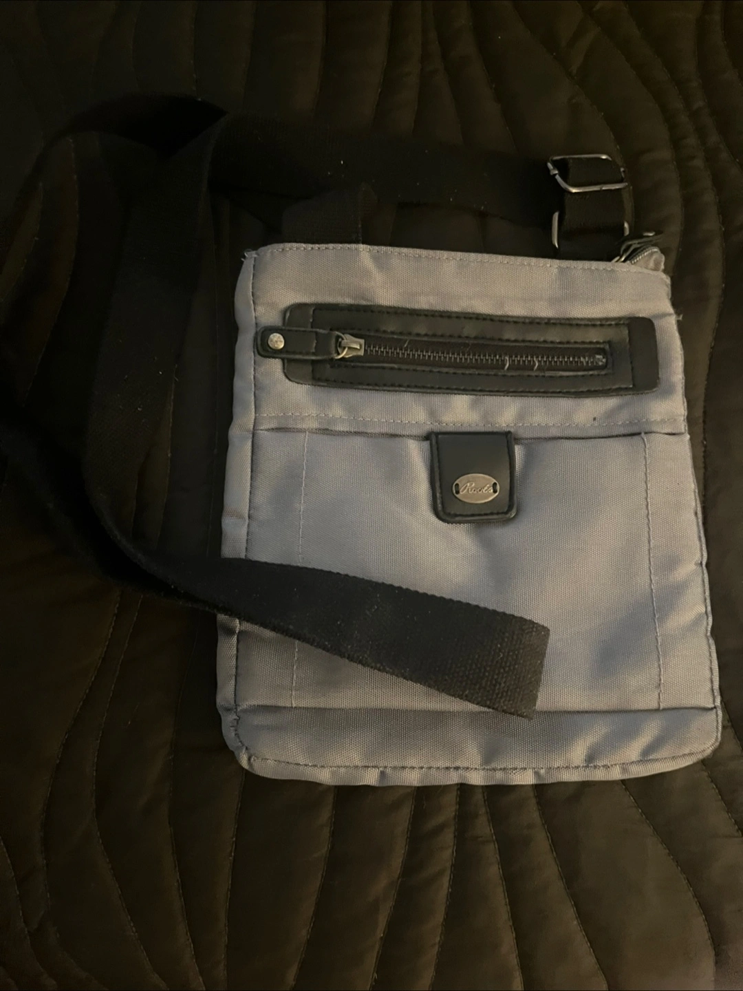 Here's a Roots crossbody bag in a soft shade of grey. The bag features a black strap, a front zippered pocket, and a small flap with a logo. The interior of the bag offers a zippered pocket.
