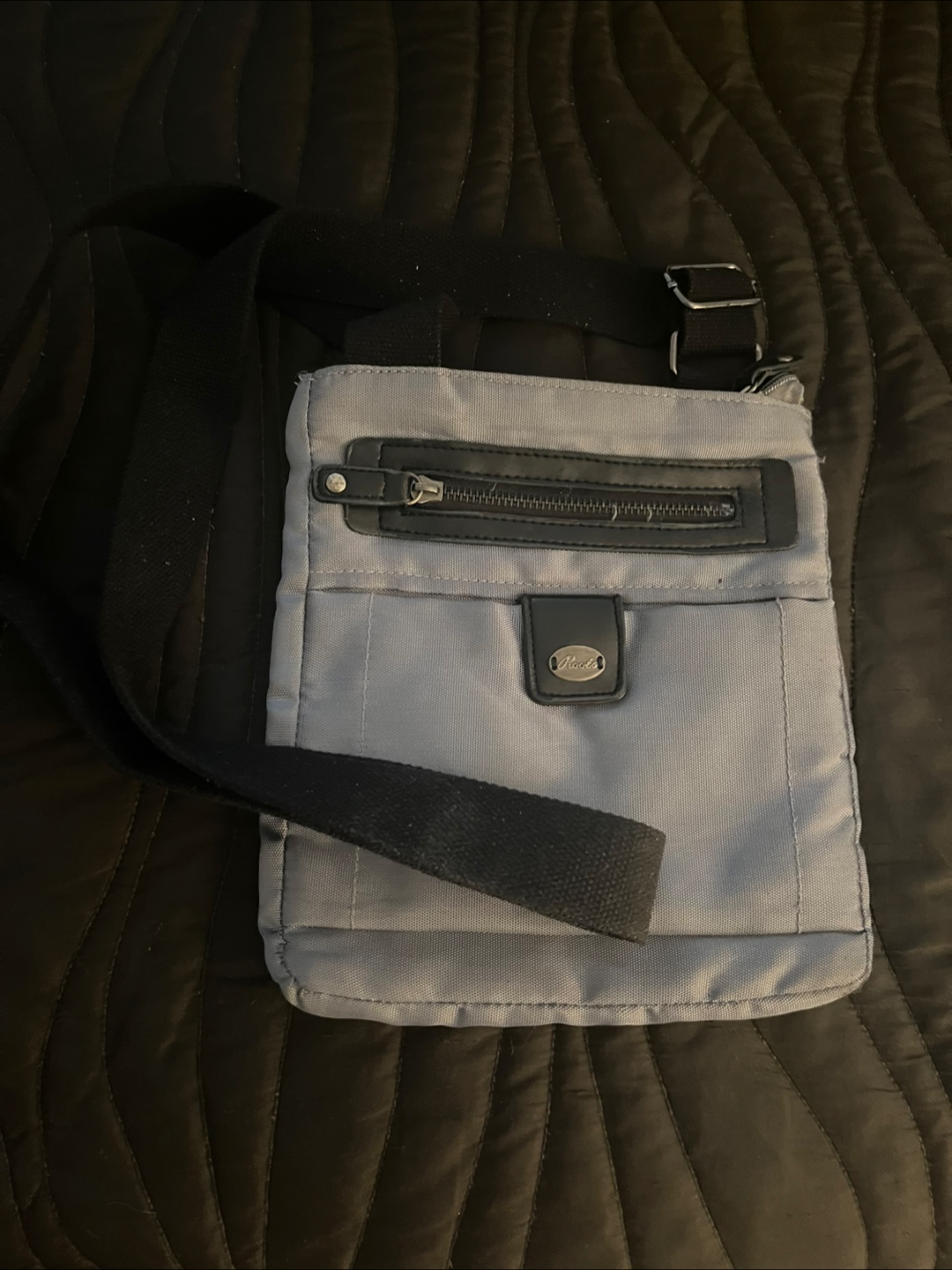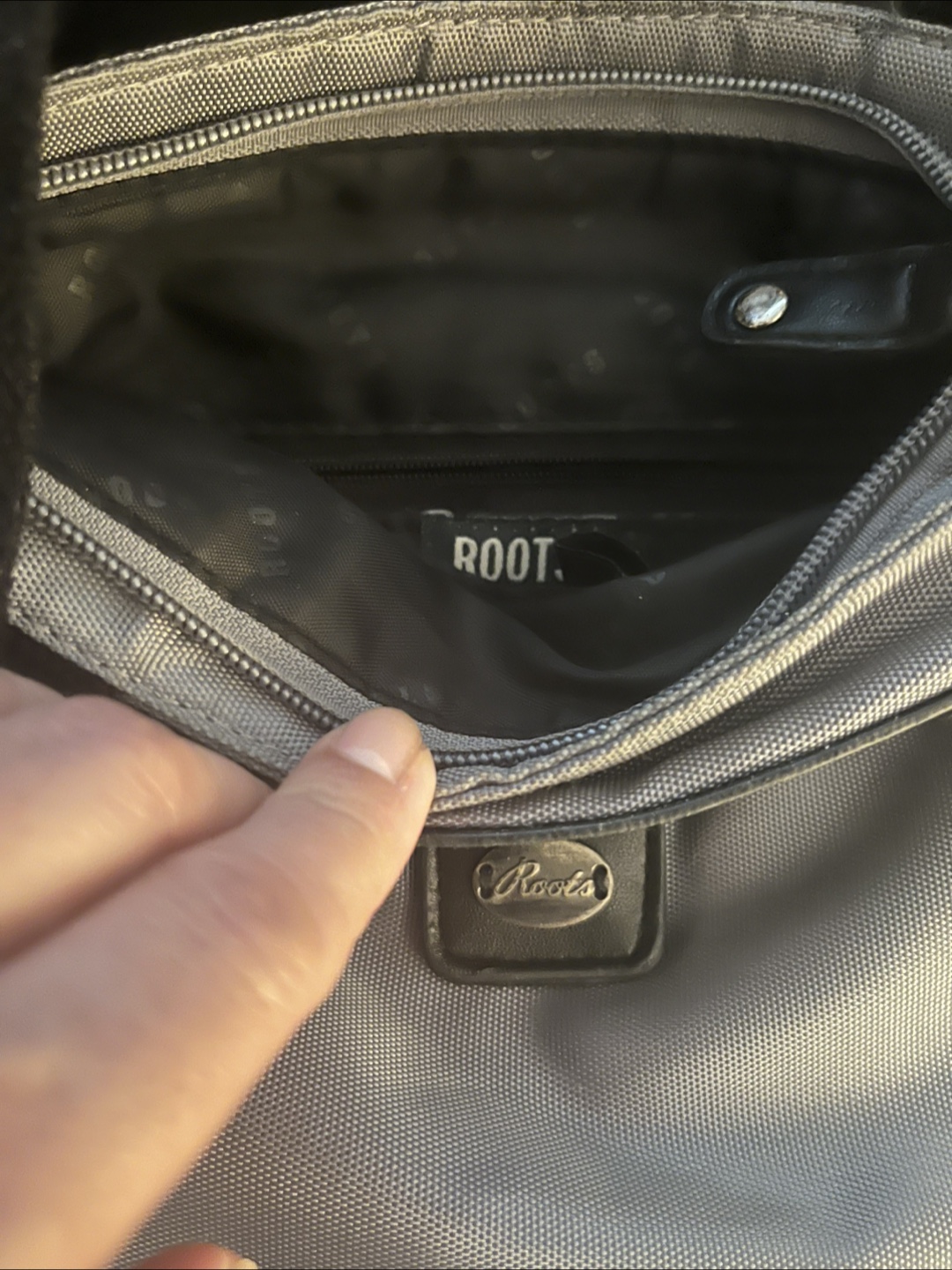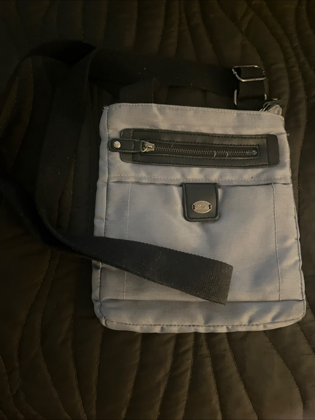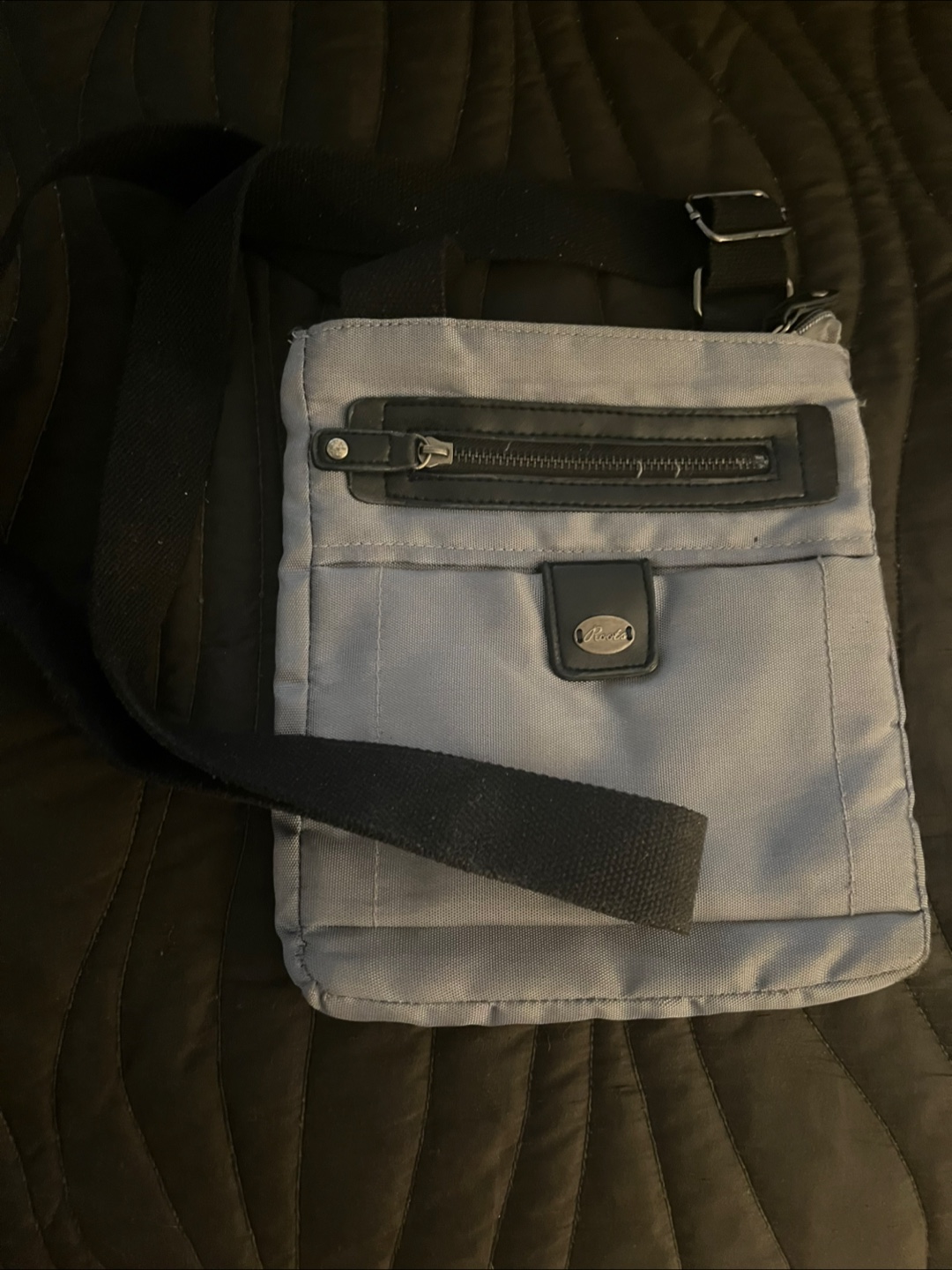 Here's a Roots crossbody bag in a soft shade of grey. The bag features a black strap, a front zippered pocket, and a small flap with a logo. The interior of the bag offers a zippered pocket.