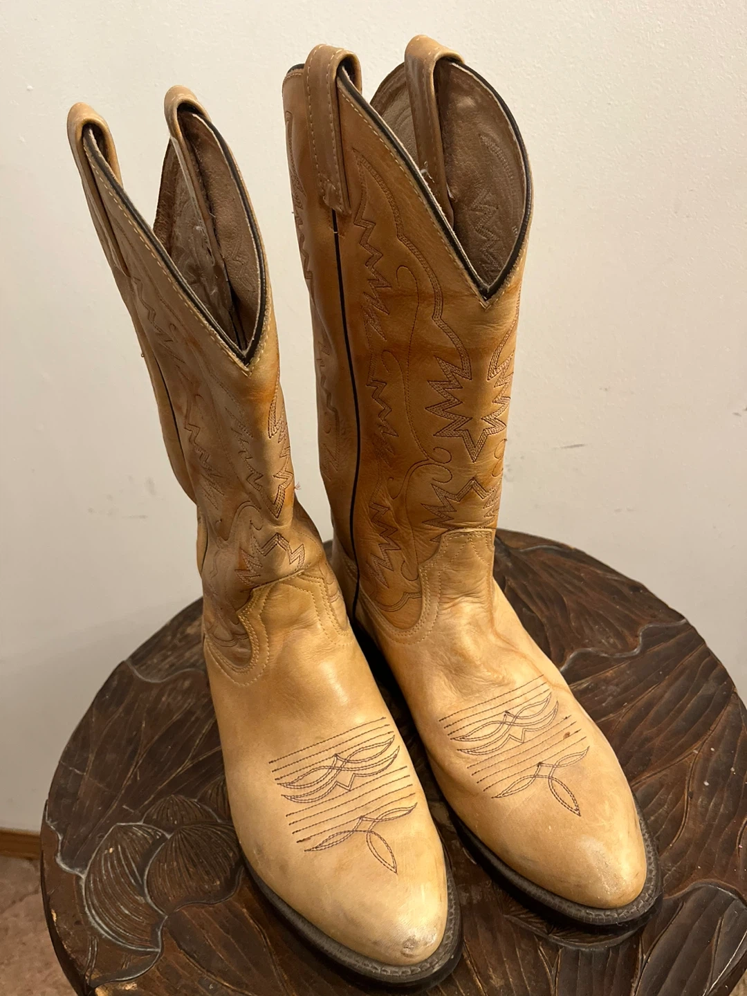 A pair of tan leather cowboy boots. These boots have classic western stitching details on the vamp and shaft. They're made from genuine leather.