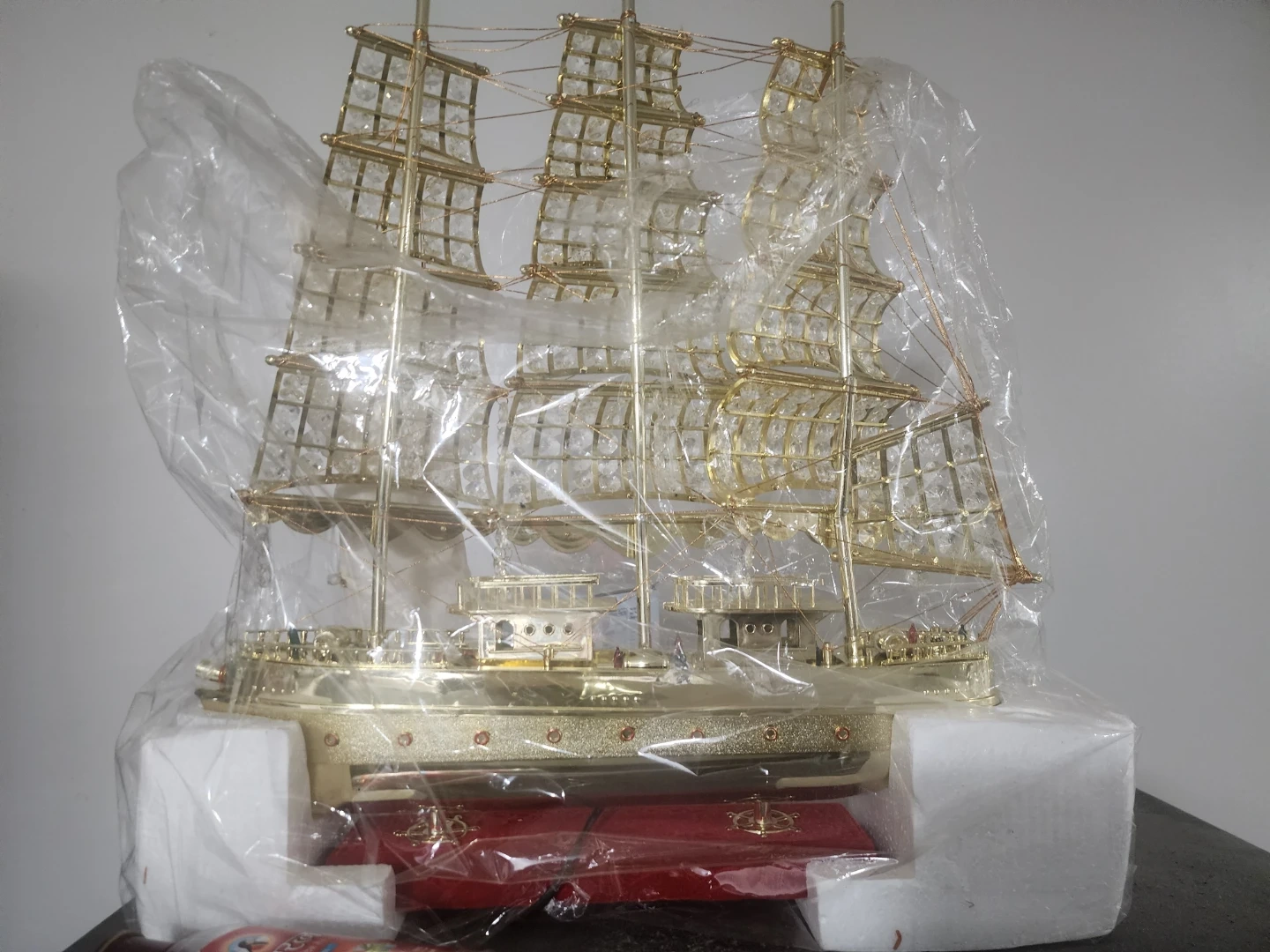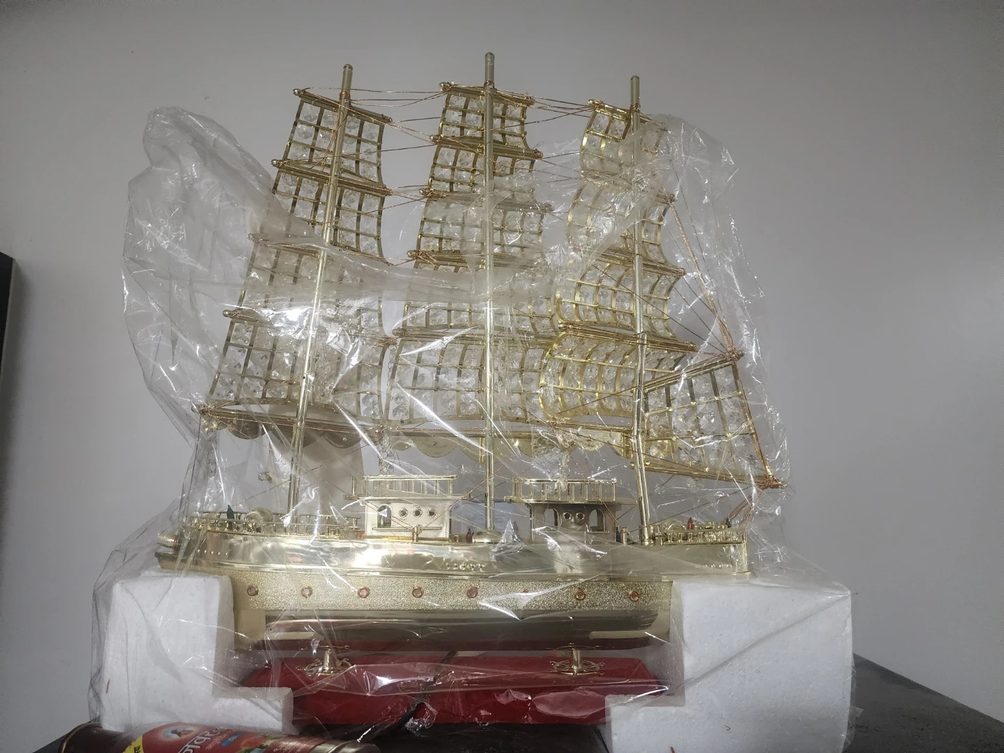 Selling a beautiful decorative gold ship model! It's still in its original packaging and looks brand new. Perfect for adding a touch of nautical charm to any room