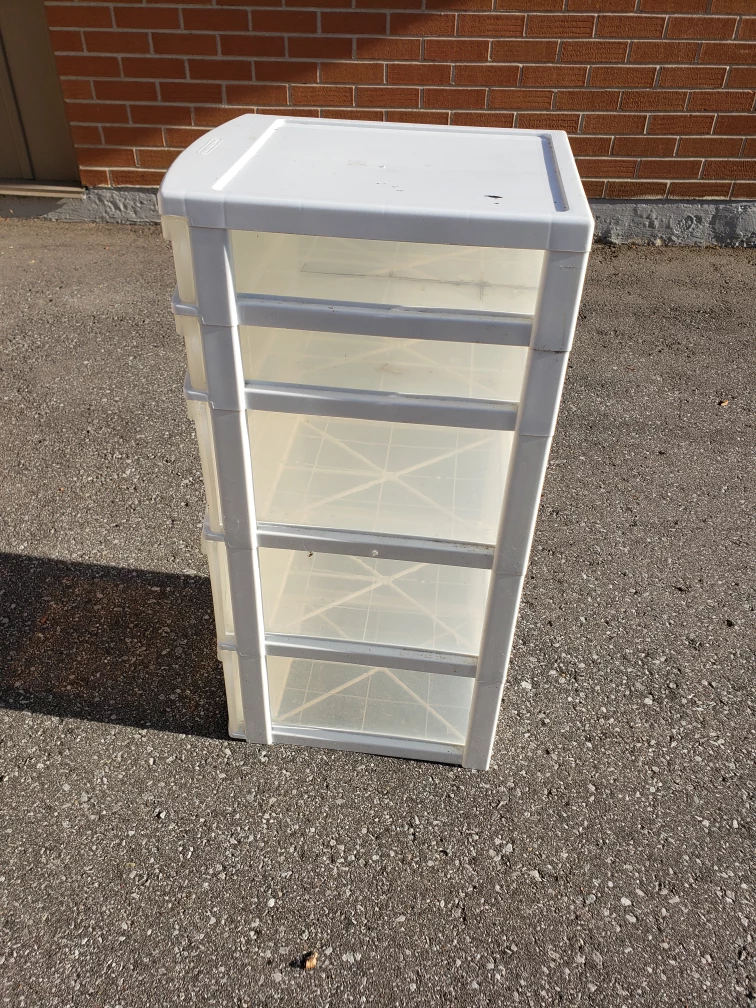 Selling a handy 5-drawer plastic storage tower. It's great for organizing clothes, toys, or anything else you need to keep tidy. It's in good condition and ready for a new home!