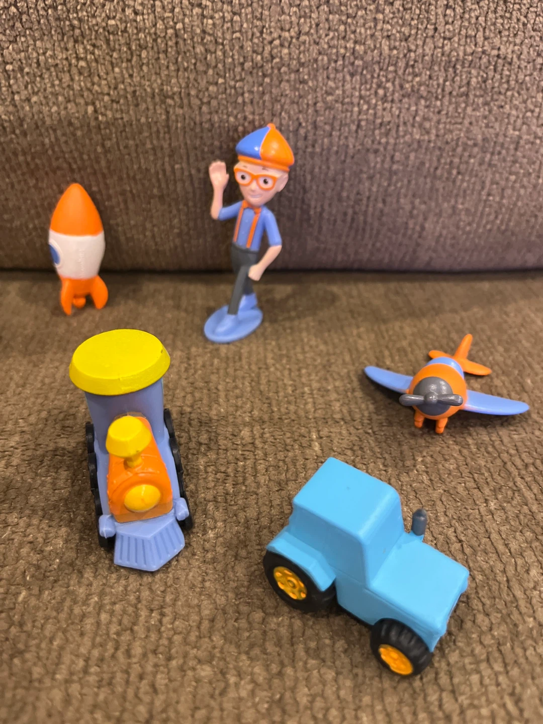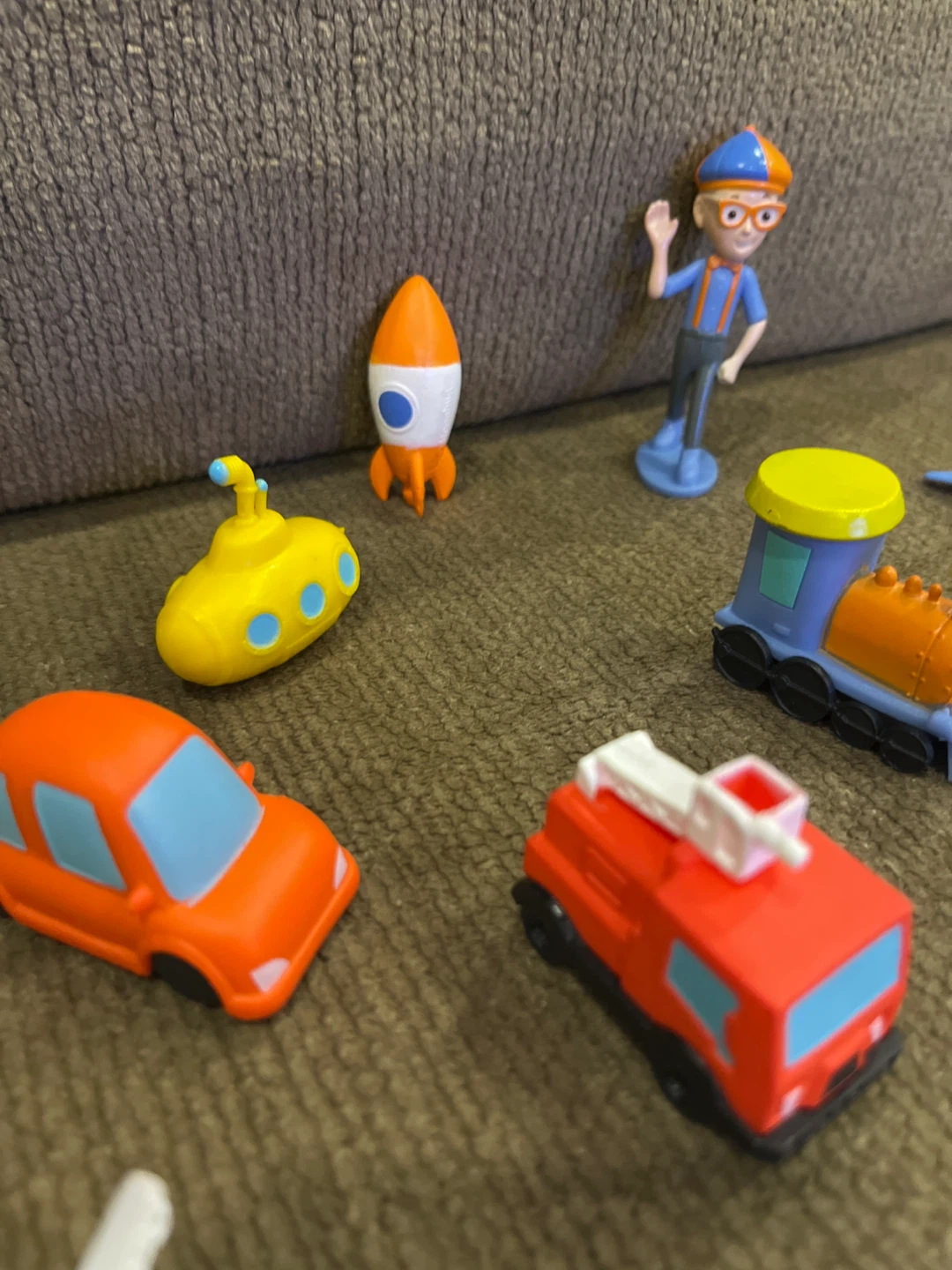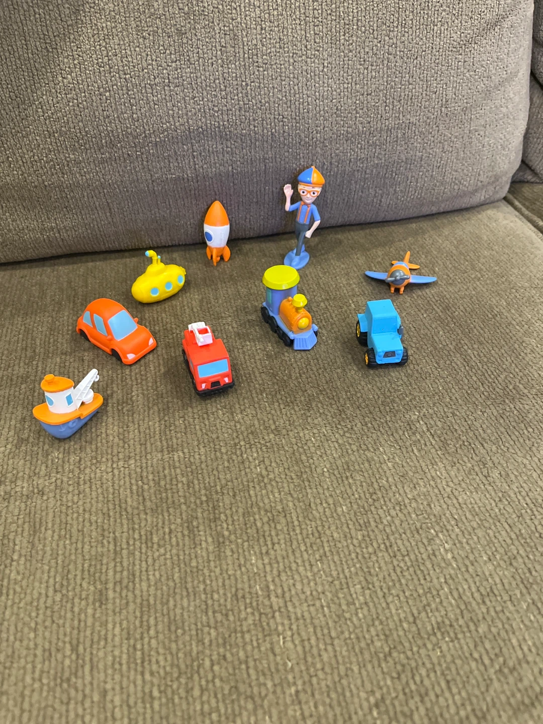 This Blippi set includes a figure, train, airplane, rocket, submarine, and truck. It's made of plastic. These toys are great for imaginative play and for young fans