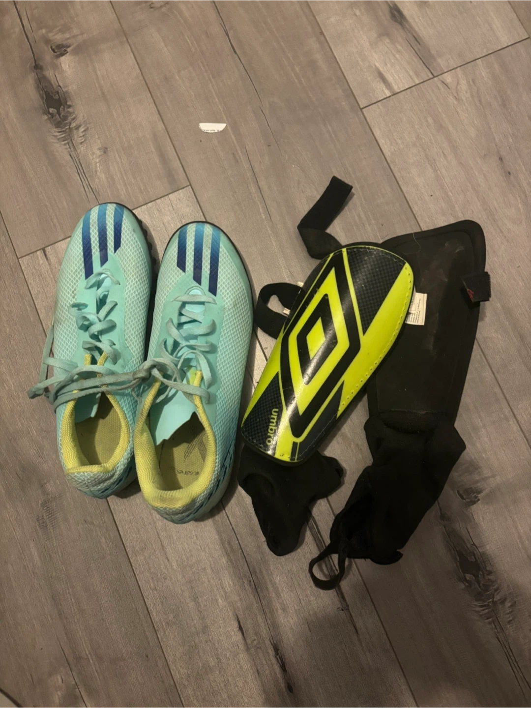 Light blue Adidas cleats with yellow accents with Umbro shin guards and black sleeves. Ready for the pitch!