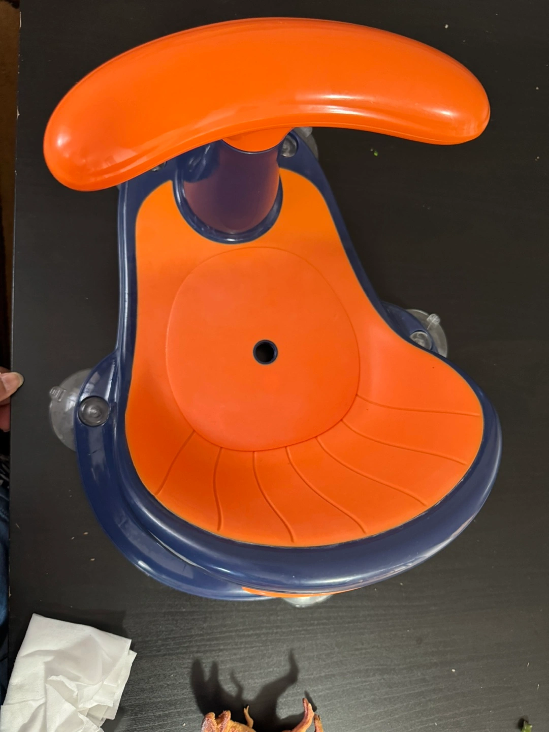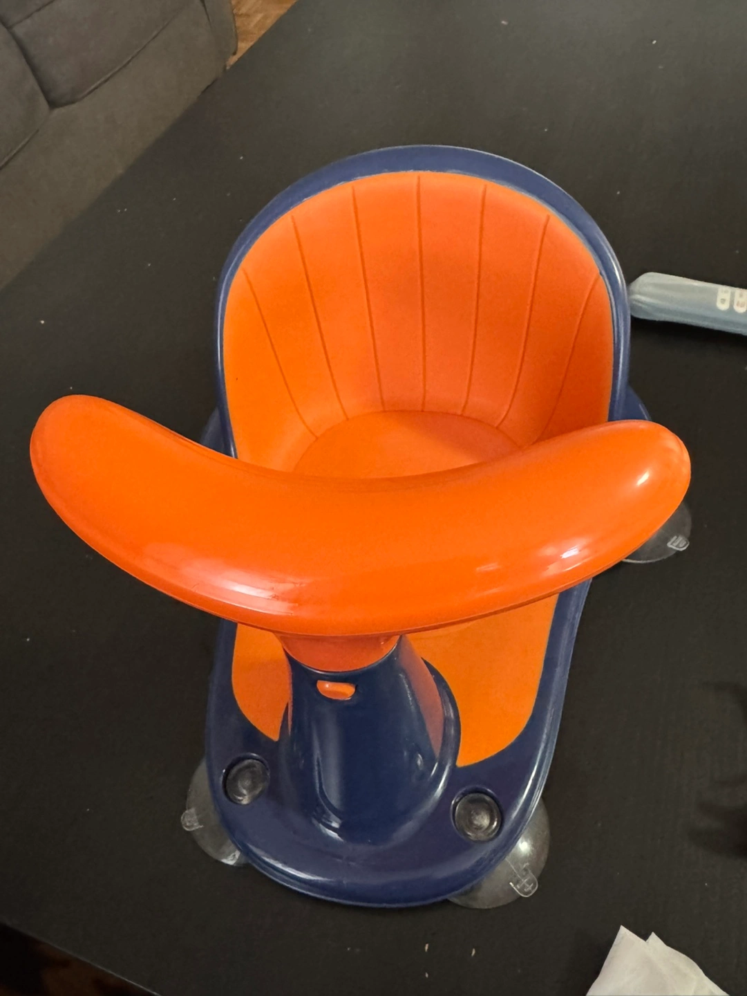 Orange and navy blue baby bathtub seat. Portable and has suction cups. Made of non-toxic TPR materials. Handle is removable. Pickup in Wellesley street east