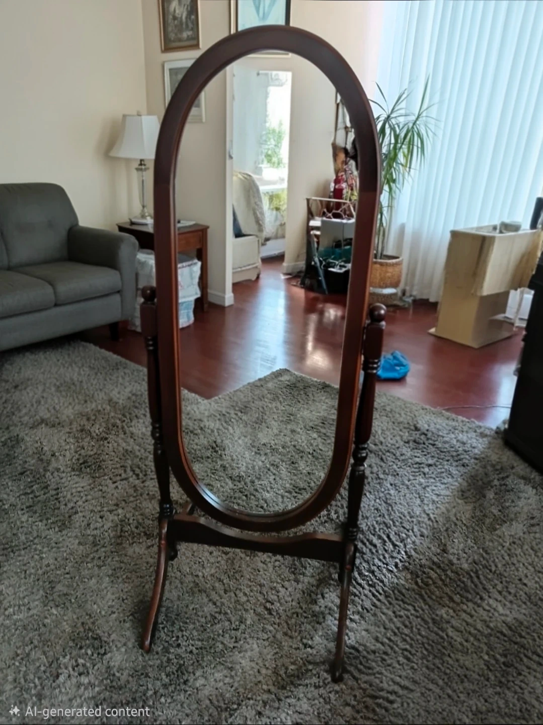 Wooden oval standing mirror. It's a floor-standing mirror with a dark wood frame. It'll look nice in a bedroom or dressing area!