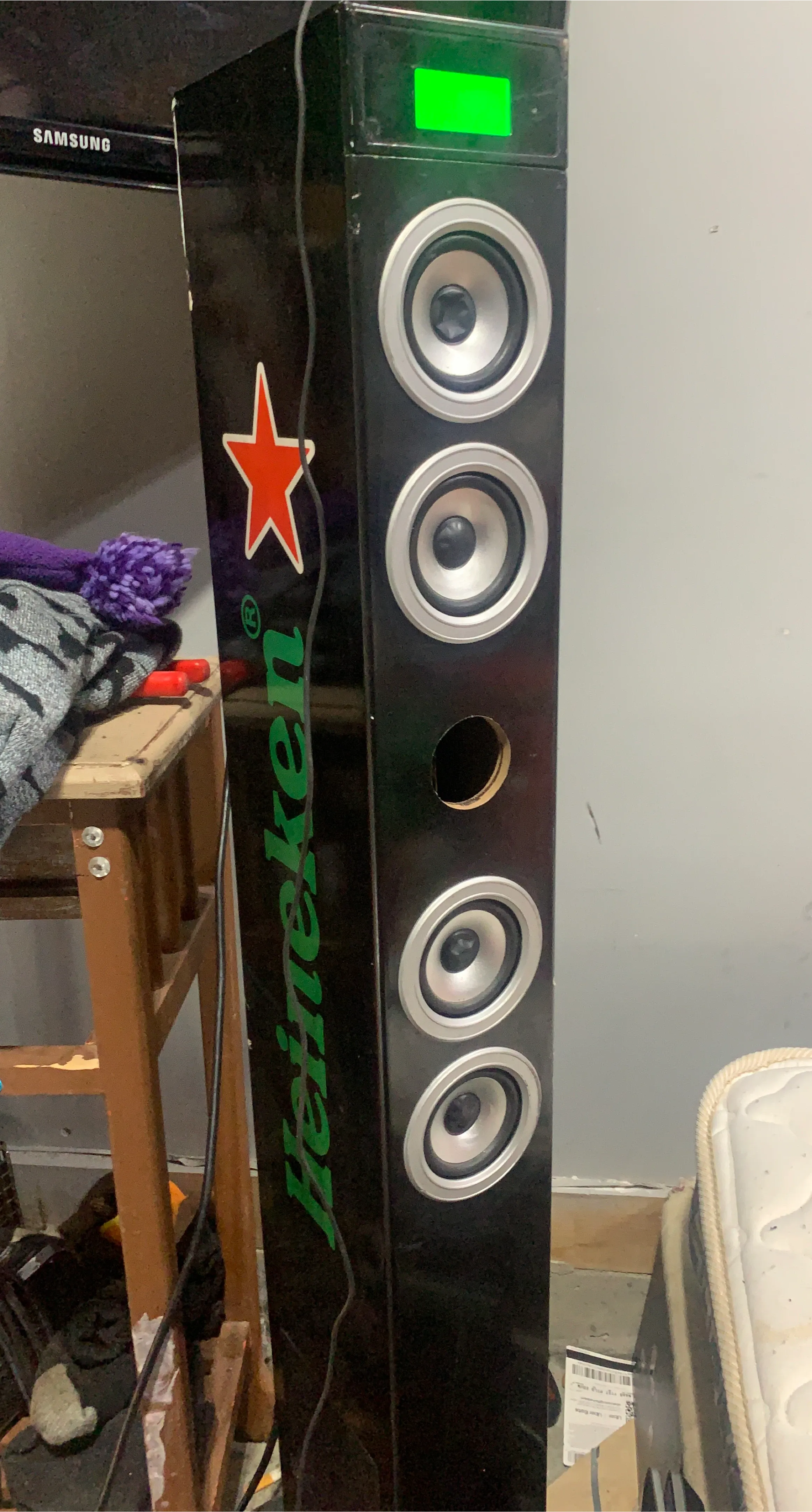 Black tower speaker with Heineken branding. It has multiple speakers and a green display. The branding is a green Heineken logo with a red star. This speaker would be great for parties or personal listening!