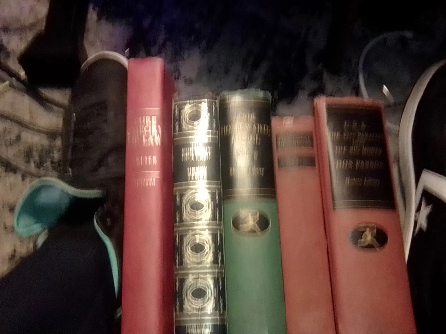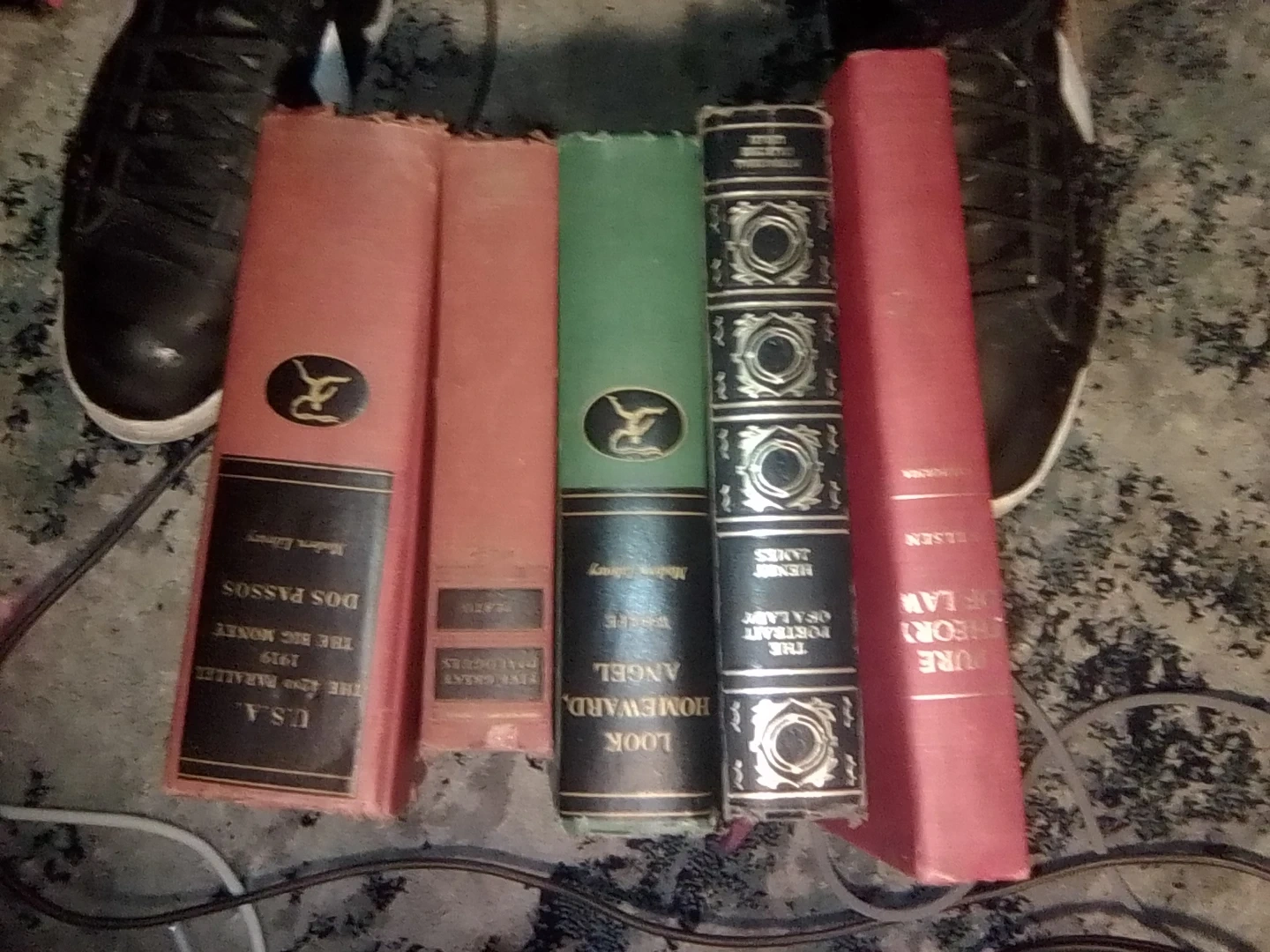 This collection includes five vintage books, all from the Modern Library edition. Titles include 'Pure Theory of Law,' 'The Portrait of a Lady,' 'Look Homeward, Angel,' 'Five Guests,' and 'U.S.A. The Big Money.' These editions feature decorative covers and are from various years.