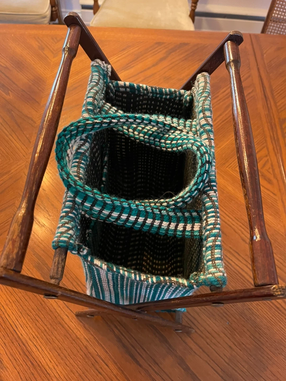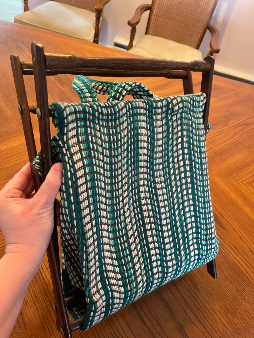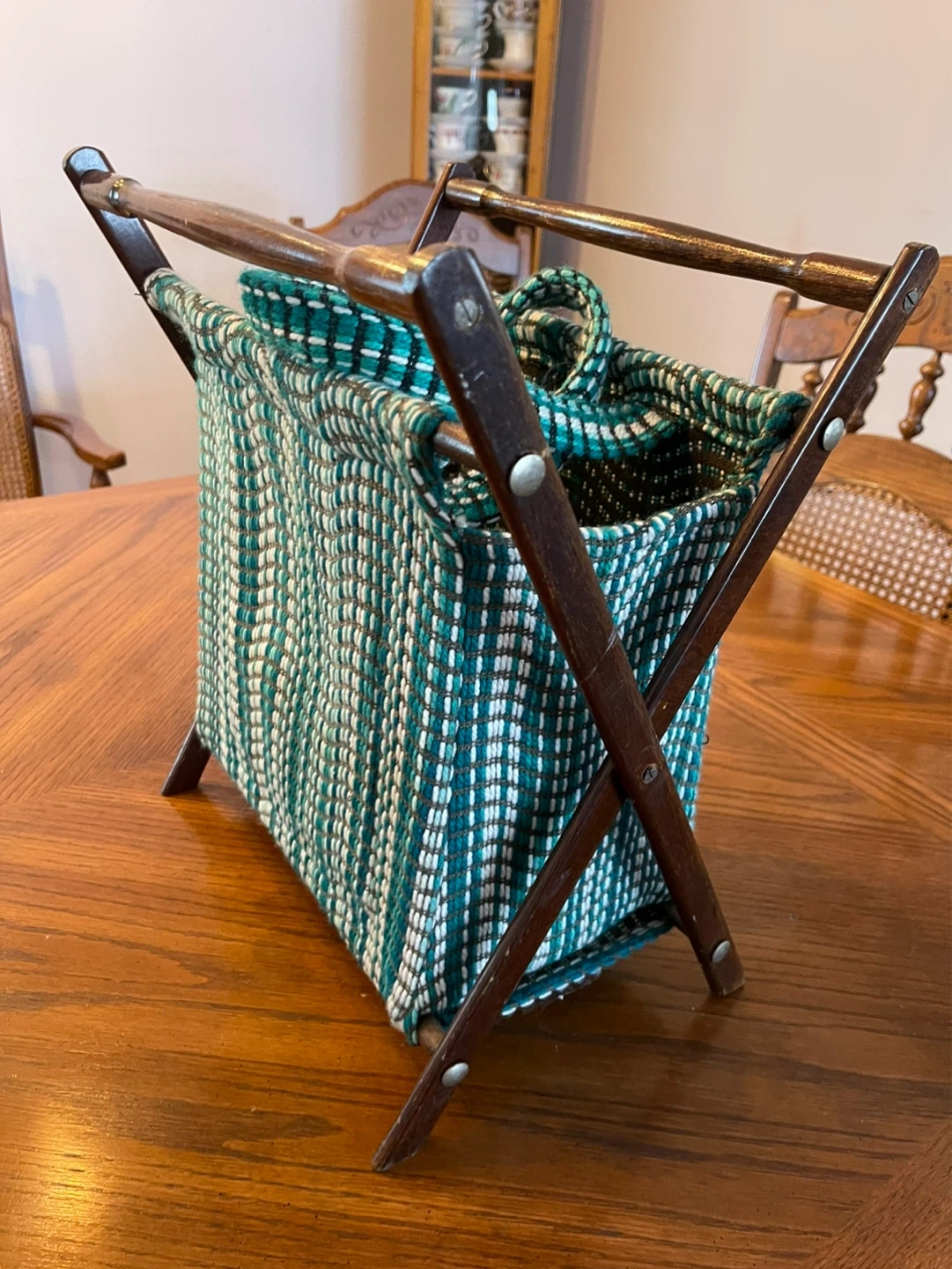 Wooden magazine rack with a woven fabric basket. It's got a classic X-frame design and a handy handle. The fabric is a green, white, and black pattern.