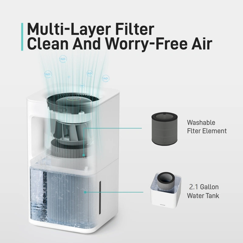 【Smart Humidity Control & Mist-Free Design】Effortlessly maintain the perfect humidity. Our large room humidifiers uses precise sensors to keep consistent moisture levels without visible vapor or residue. The evaporative design and filtration system white dust, making it cleaner and easier to maintain. with top-fill design, refills are quick and mess-free. up to 300mL/h output, Its whisper-quiet operation ensures a peaceful, comfortable environment while optimizing moisture levels for healthier air.