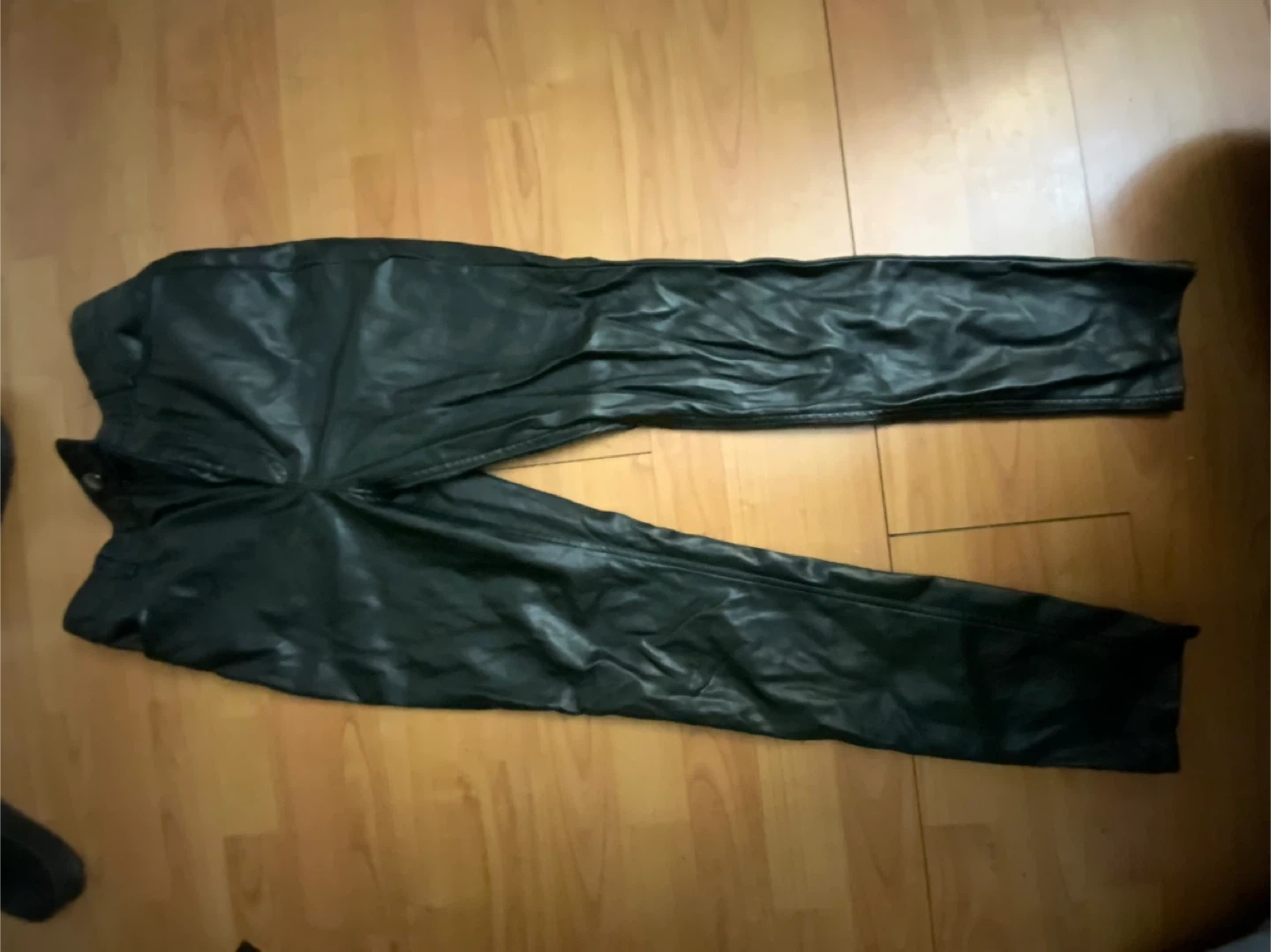 Selling a pair of Dynamite faux leather pants in black, size 4. They're in wrinkly condition and ready to be pressed and added into a new wardrobe!