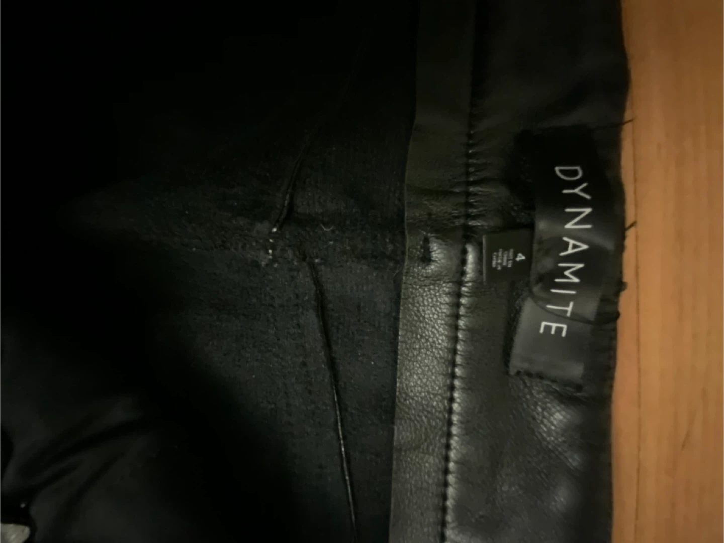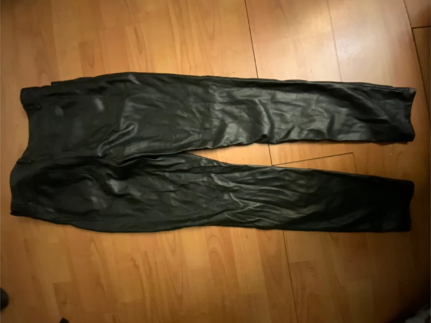 Selling a pair of Dynamite faux leather pants in black, size 4. They're in wrinkly condition and ready to be pressed and added into a new wardrobe!