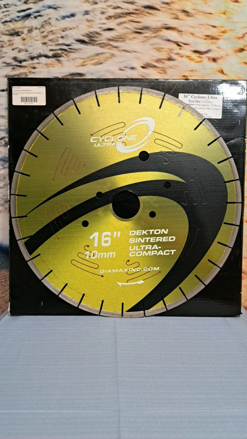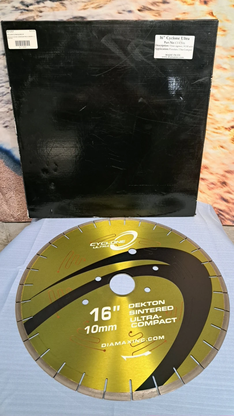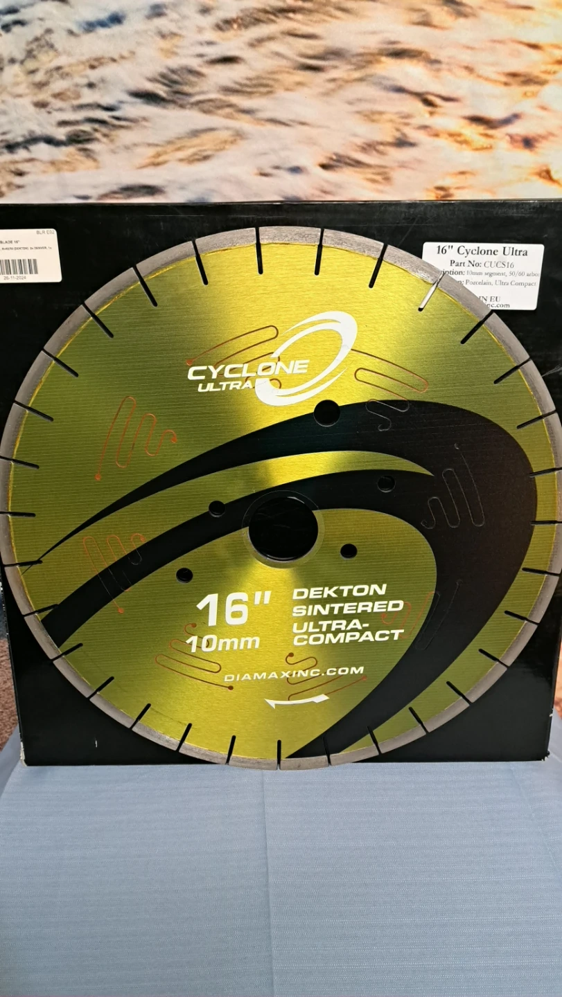 The Cyclone Ultra blade was specifically designed for cutting sintered stone materials like Dekton, Neolith, Techlam, and others. It boasts a noise-reducing silent core and a top-notch diamond bond, allowing it to effortlessly slice through tough materials while minimizing chipping. Additionally, the Ultra's bond reduces the strain on the machine and requires less frequent dressing. The Cyclone Ultra blade is an excellent option for clean and efficient cuts on extra hard materials.