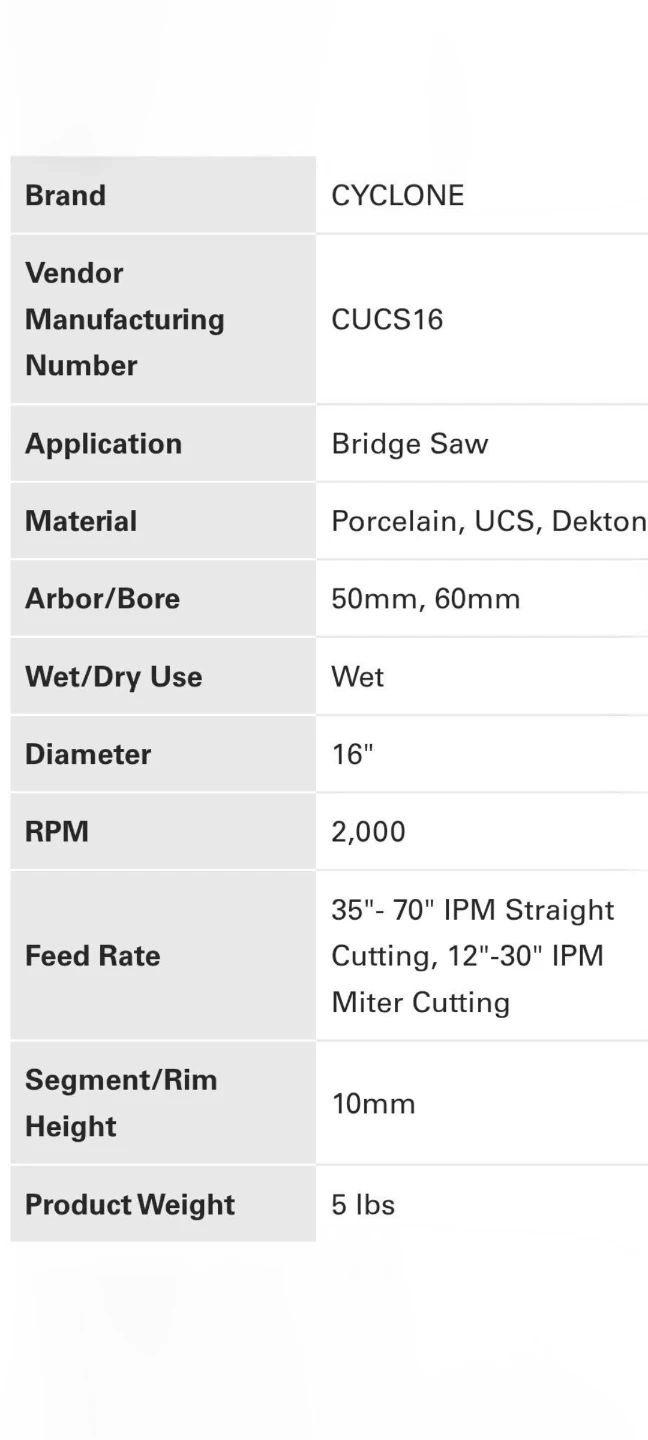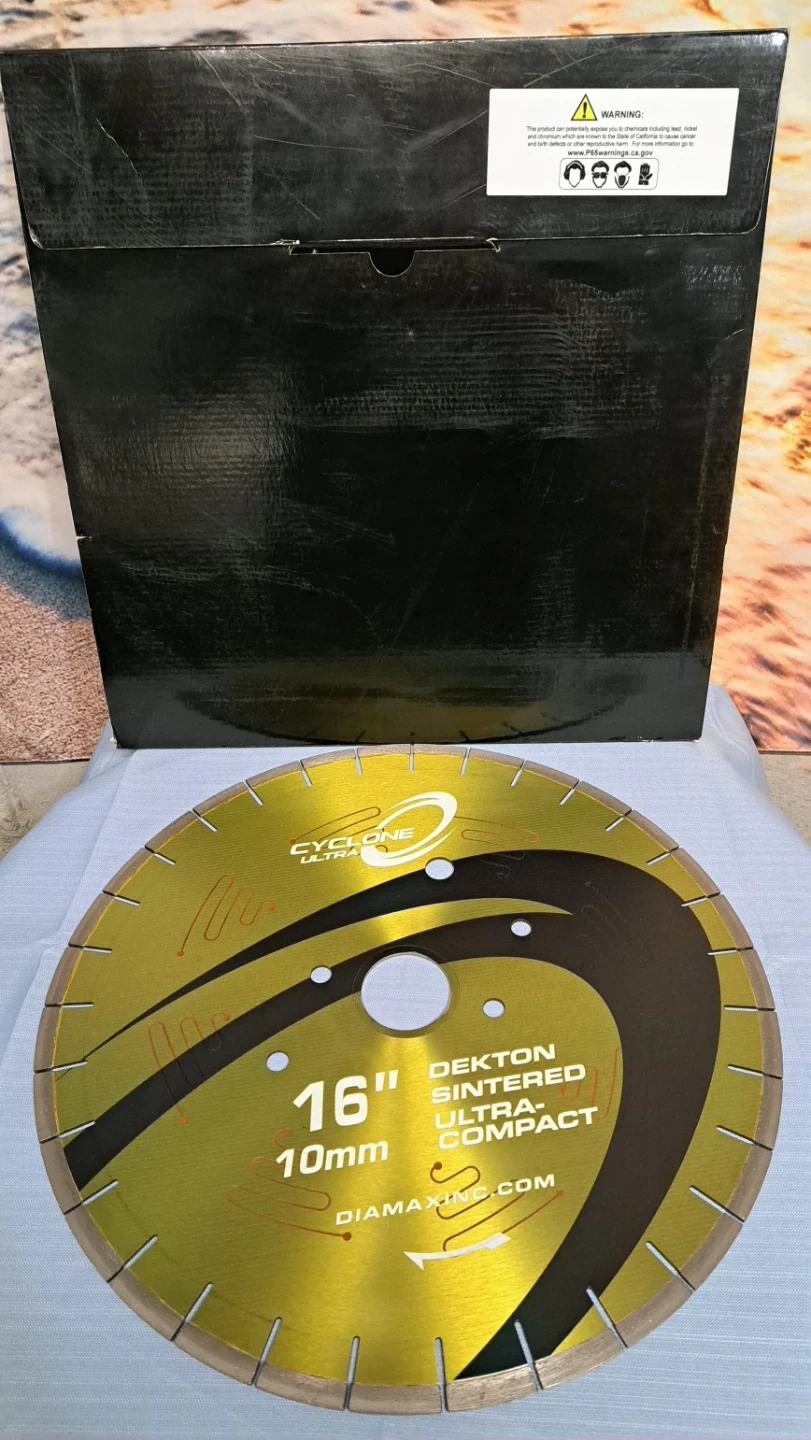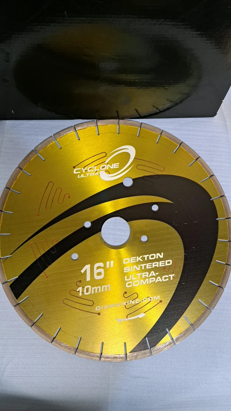 The Cyclone Ultra blade was specifically designed for cutting sintered stone materials like Dekton, Neolith, Techlam, and others. It boasts a noise-reducing silent core and a top-notch diamond bond, allowing it to effortlessly slice through tough materials while minimizing chipping. Additionally, the Ultra's bond reduces the strain on the machine and requires less frequent dressing. The Cyclone Ultra blade is an excellent option for clean and efficient cuts on extra hard materials.