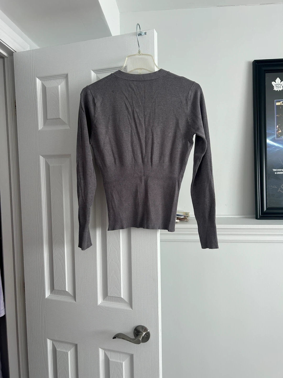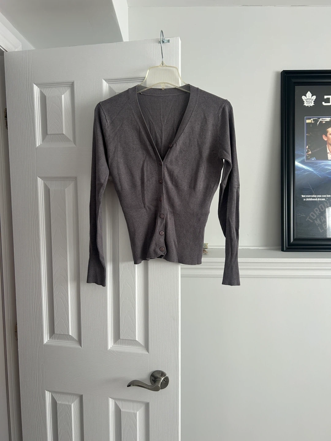 Selling a gently used grey cardigan sweater. It's in great condition and perfect for layering! The material is soft and comfortable. It has a classic button-down design.
