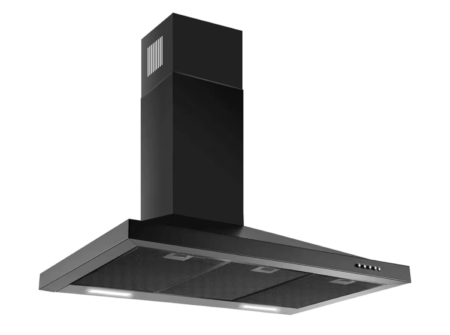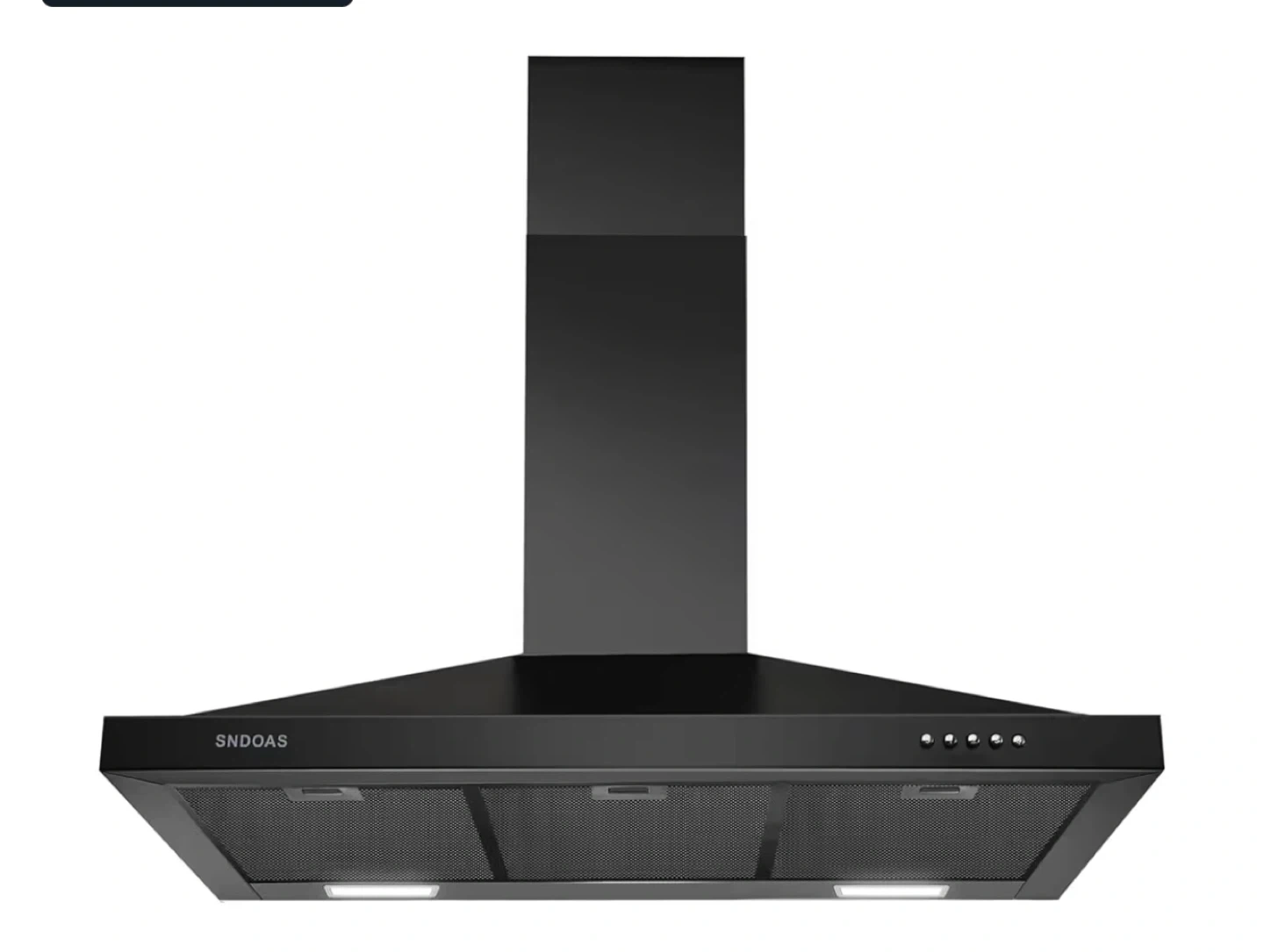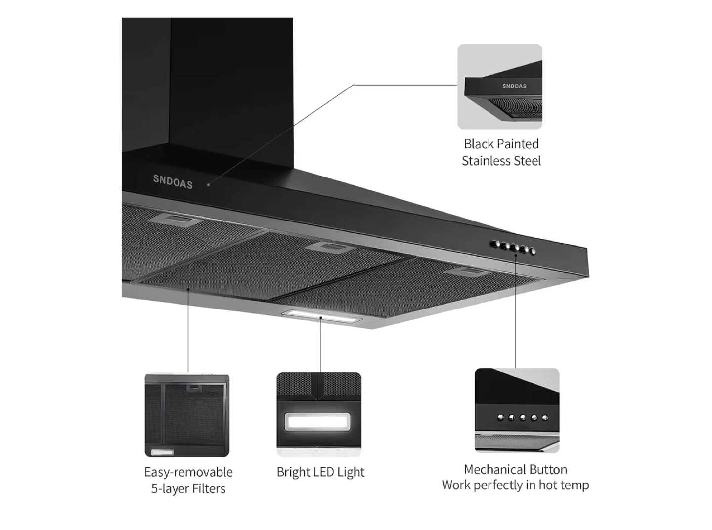Selling a SNDOAS range hood in black painted stainless steel. It features an adjustable chimney, easy-removable 5-layer filters, and bright LED lights. Also has mechanical buttons that work perfectly in hot temperatures. Dimensions are 35.2" x 18.3" x 7.1".
