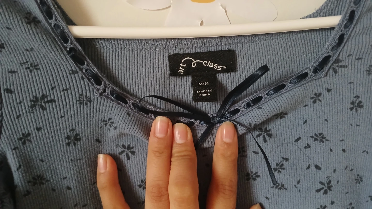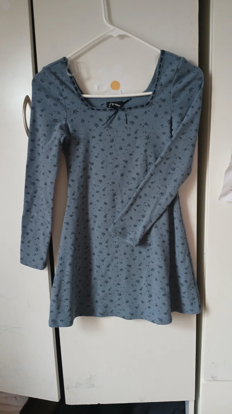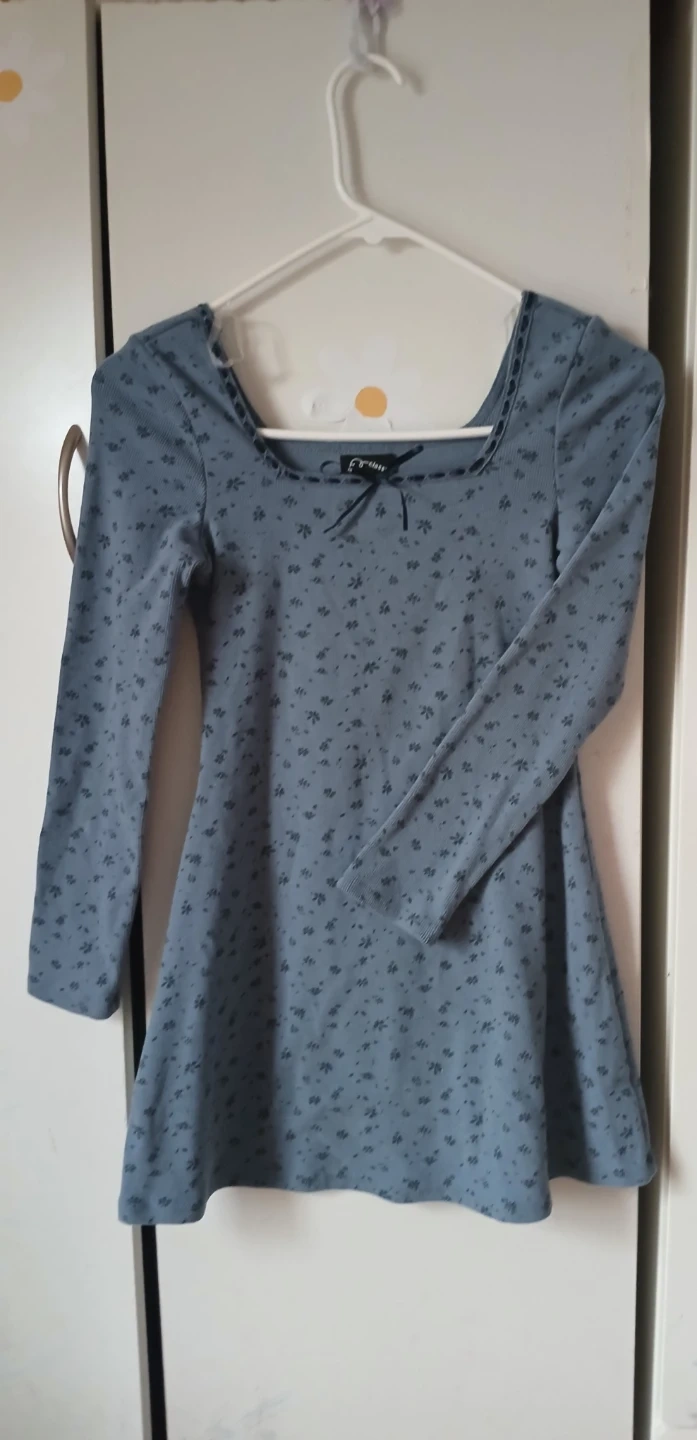 Juniors' blue dress with a floral print. Features a square neckline and long sleeves. Size M (8).