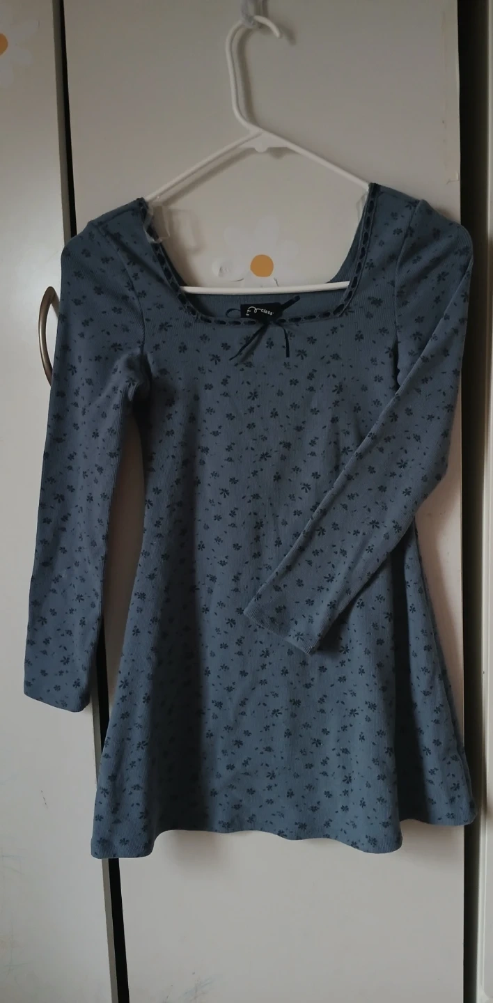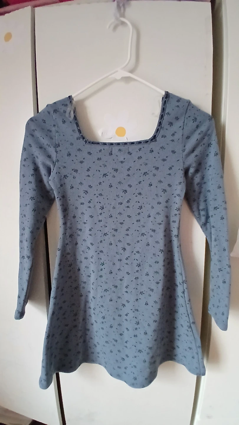 Juniors' blue dress with a floral print. Features a square neckline and long sleeves. Size M (8).