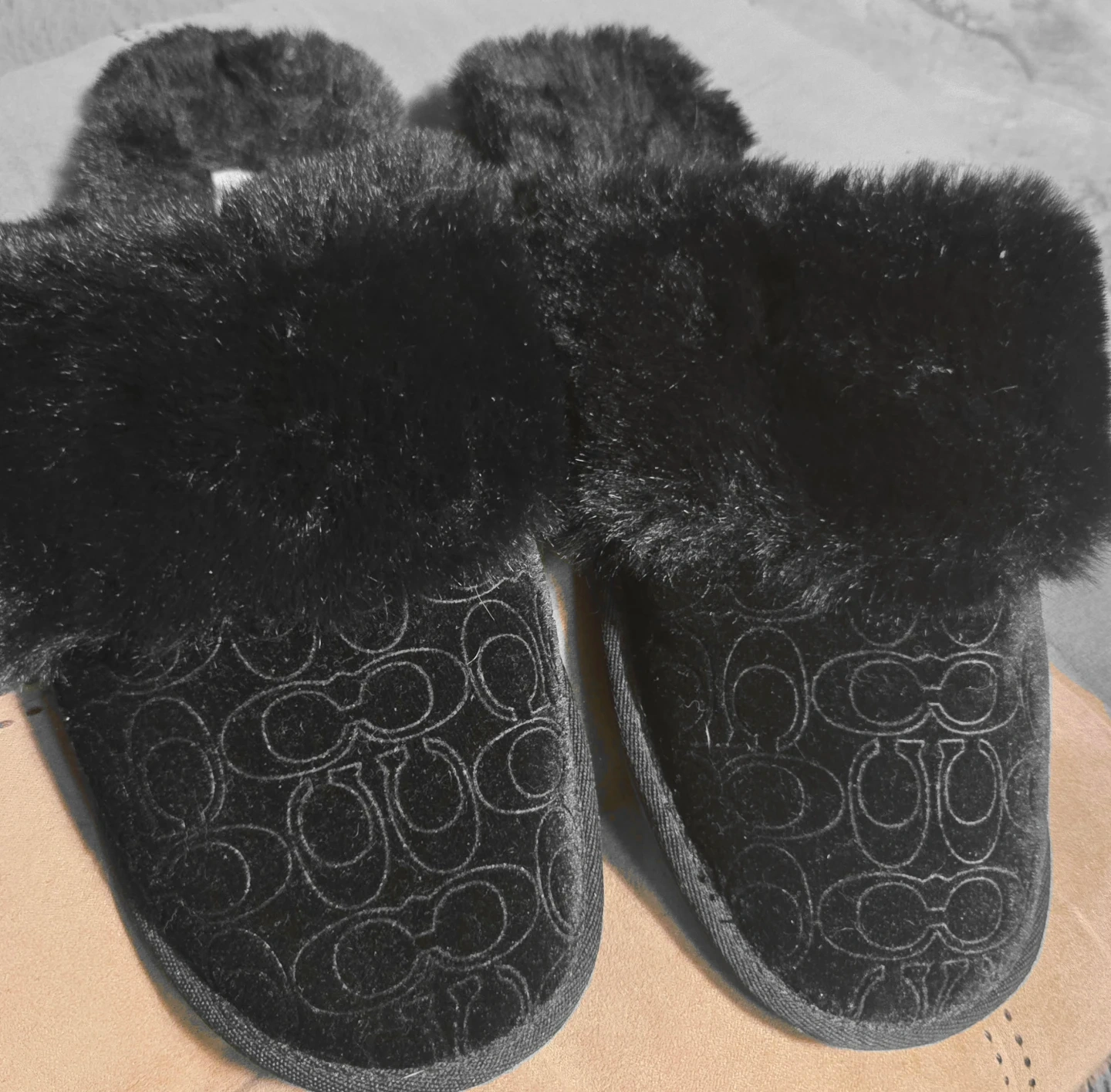 Cozy Coach velour slippers featuring the signature C logo pattern. They're finished with a soft faux fur trim for extra warmth. Made with 100% polyester.