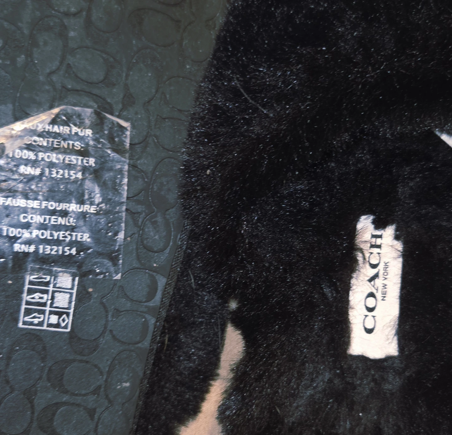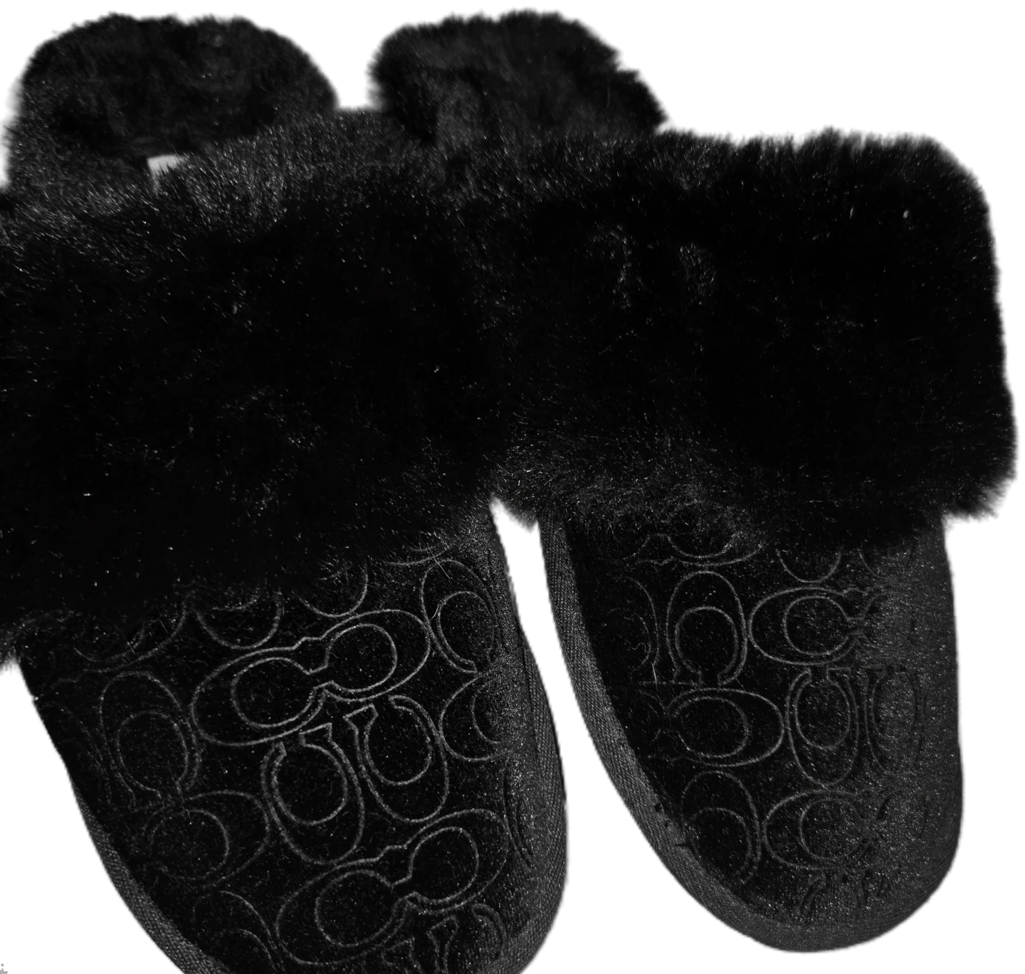 Cozy Coach velour slippers featuring the signature C logo pattern. They're finished with a soft faux fur trim for extra warmth. Made with 100% polyester.