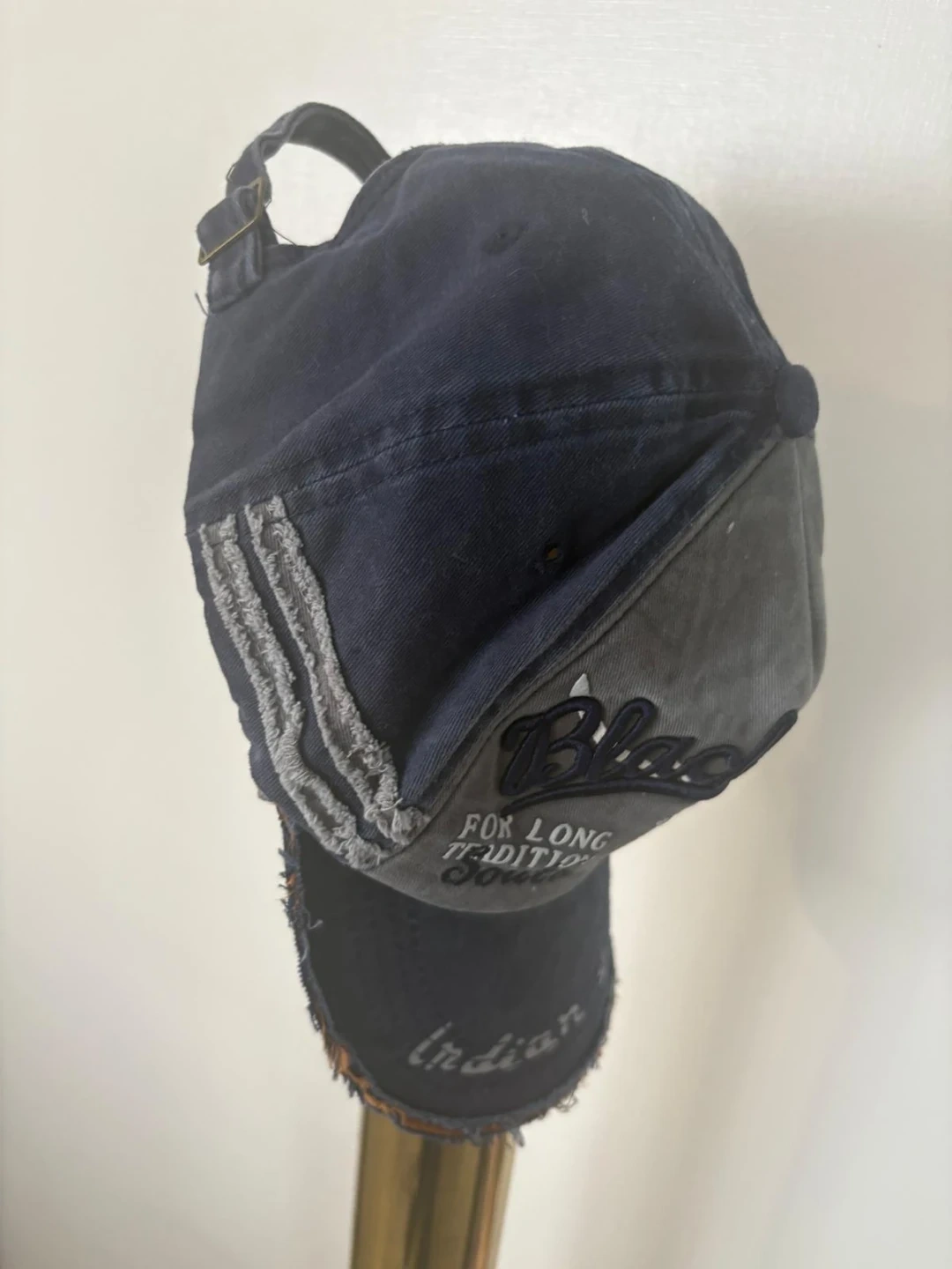 This is a "Black Rebel" baseball cap with "Indian Dakota" embroidered on the front. It features a distressed, washed denim look with grey and navy panels. The cap has an adjustable strap at the back.